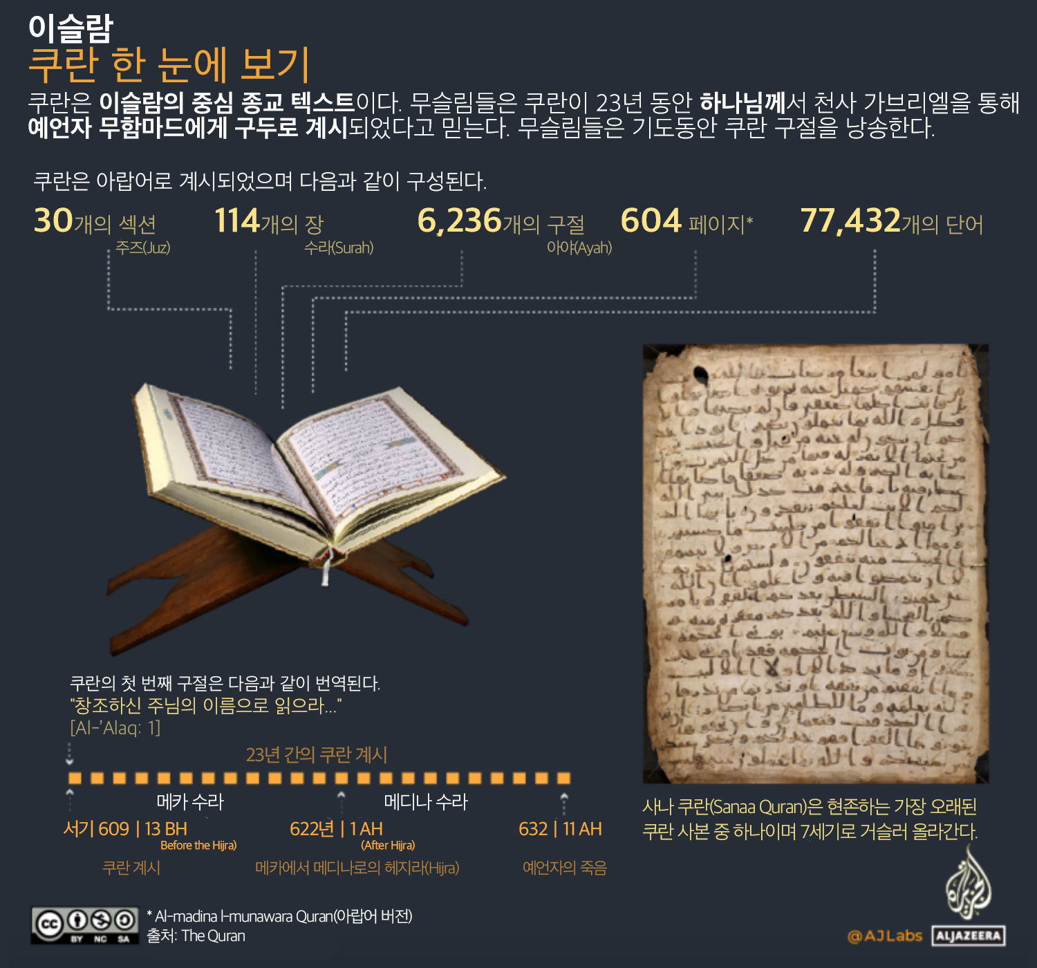 * 역자 주: 쿠란(Quran, 코란 혹은 꾸란)은 이슬람의 중심이자 핵심 텍스트이다. 무슬림들은 매일 5차례의 기도 동안 쿠란의 내용을 암송한다. 쿠란은 모두 30개의 섹션과 114개의 장, 6,236개의 구절과 77,432개의 단어로 구성되어 있다. 쿠란은 상당히 정교한 구성을 보이고 있는데 그 정교성은 단어와 대칭의 사용에서 잘 드러난다. 예를 들어, 대칭적인 삶과 죽음, 천사와 악마, 남성과 여성은 쿠란 전체에 각각 145번, 88번, 24번 언급된다. "날"(day)은 쿠란에서 1년의 날 수와 같은 365번 반복되며 "달"(month)이라는 단어는 1년의 달 수와 같은 12번 반복되며, 복수형의 "날들"(days)은 한 달의 일 수와 같이 30번 반복된다. 한국의 무슬림 인구는 6만 명에 불과하지만 전 세계적으로 무슬림 인구는 20억 명으로 전 세계 인구의 약 25%를 차지한다. 따라서 이슬람을 이해하는 데 있어서 가장 빠른 길은 쿠란의 이해이다. 이 글은 Al Jazeera의 기사 Visualising the Quran의 번역으로 쿠란이 어떤 형식으로 구성되었으며, 쿠란과 라마단은 어떤 관계이며, 쿠란의 내용적 특성과 주요 등장 어휘는 무엇이며, 쿠란에 등장하는 신(알라)들은 어떤 명칭들로 불리며, 아담부터 무함마드까지 몇 명의 예언자가 등장하며, 전 세계적으로 얼마나 보급되었는가에 대해 설명하고 있다.