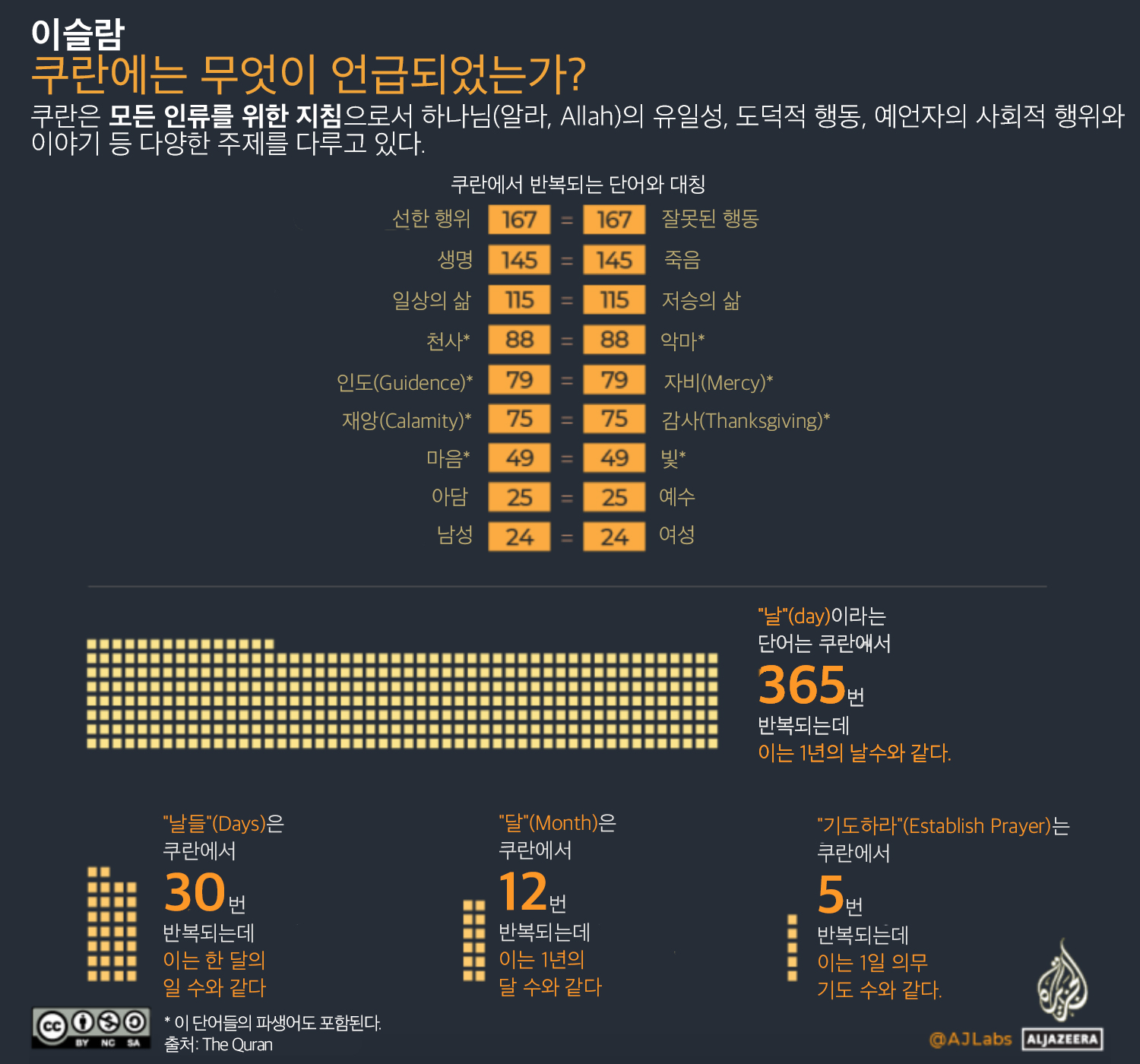 "날"(day)이라는 단어는 쿠란에서 365번 반복된다. 일부 학자들은 이를 1년의 날수로 연결했다. "달"(month)이라는 단어는 쿠란에서 12번 반복됩니다. 복수형의 "날들"(days)은 한 달의 일 수와 같이 30번 반복된다.