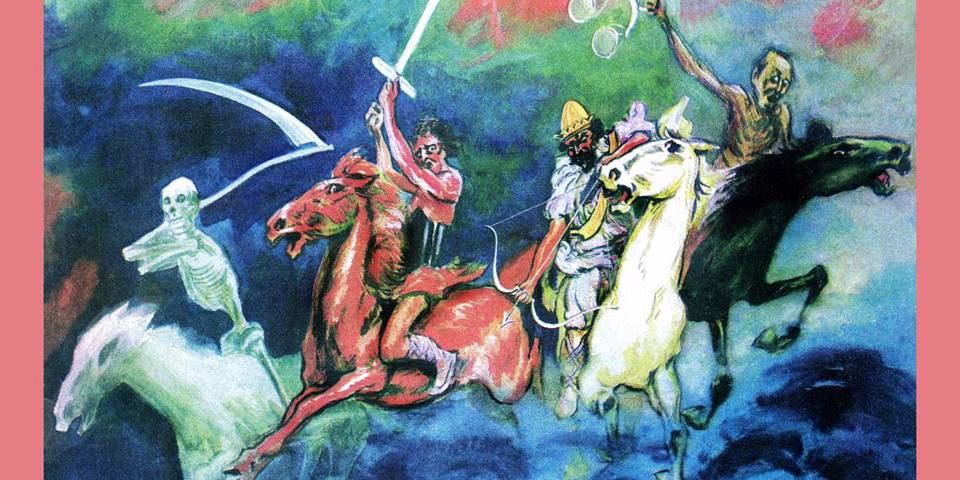 세계는 전염병, 전쟁, 기아, 죽음이라는 묵시론의 네 기사를 불러일으키는 다중적 동시 위기를 겪고 있다. 이 기사들은 단순히 악의 형상이라고 무시할 수 없다. 캐나다 녹색당의 초대 당수인 트레버 핸콕(Trevor Hancock)이 말했듯이, 그들은 "자연의 인구 규모를 조절하는 생태학의 4명의 기사라고 부를 수 있는 것과 매우 유사합니다." 생태학적 측면에서 "4명의 기사"는 인구 과잉을 방지하는 긍정적인 역할을 한다. 그러나 인간의 경우 이 규제 기능이 작동하지 않아 왔다.