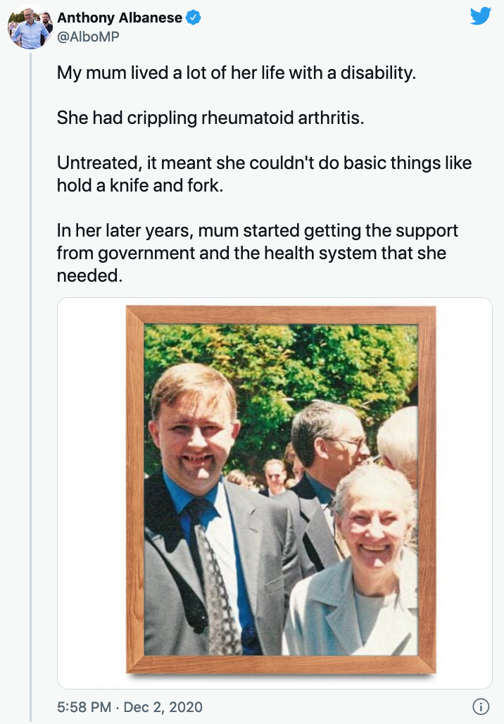 전체적으로 앨버니지는 총리 지망생치고는 이례적으로 겸손한 페르소나의 소유자인데, 이는 그가 리더십 대한 특권의식(sense of entitlement)이 전혀 없었다는 그의 주장과 잘 어울린다. 동시에 거기에는 회복력과 자기 믿음의 핵심이 있다. 그의 내면의 힘은 그가 일상적으로 회상하는 그의 궁핍한 배경 스토리에 뿌리를 두고 있다. 이것은 공영주택에서 홀어머니와 병약한 연금 수급자의 독자로 자란 이야기이다. 그의 어머니의 투쟁은 그의 정치적 소명의 길잡이이다.