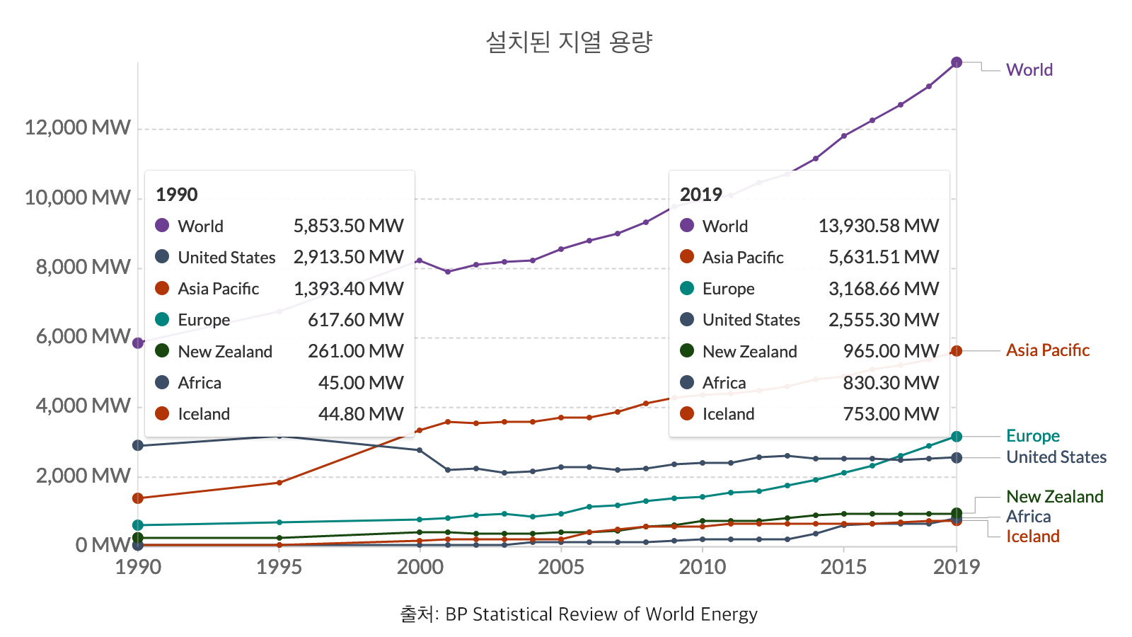 지열을 이용한 발전은 꾸준히 증가 중이지만 앞 서 언급했던 재생에너지와 비교할 때 그 발전량은 아직 미미하다. 2019년 현재 지열을 이용한 발전은 전 세계적으로 약 1만4천 메가와트에 불과하다.