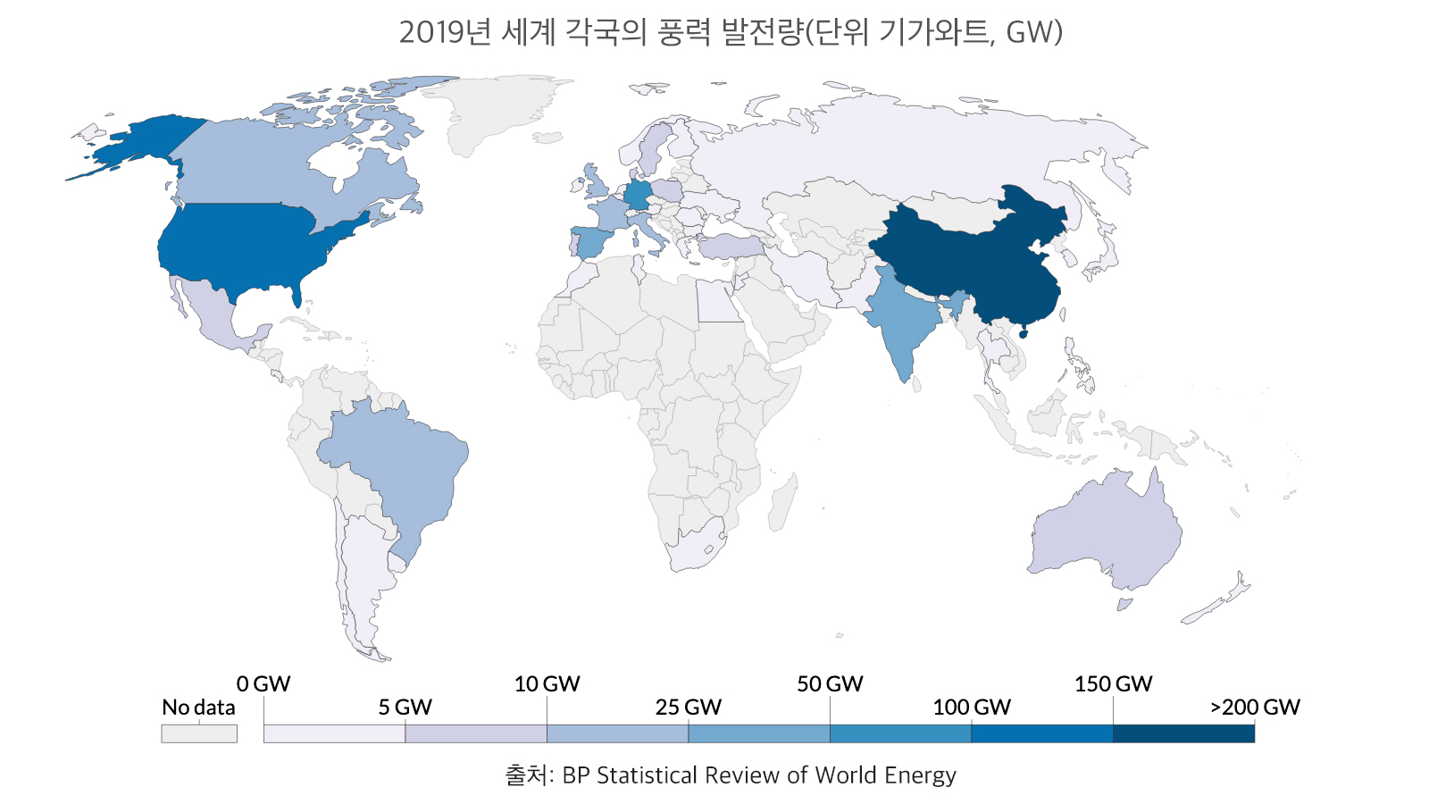아래 차트를 보면 풍력발전량은 1997년 부터 2019년까지 7.62 기가와트에서 622.70 기가와트로 80배 이상 증가했다. 같은 기간 풍력 발전은 유럽에서 40배 이상, 미국은 60배 이상 급증했다. 한국의 풍력 발전 역시 급증했지만 발전량 자체는 1.51 기가와트로 미미한 형편이다.