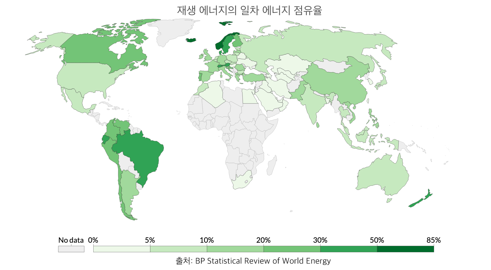 아래 도표에서 보듯 세계 재생에너지의 일차 에너지 점유율은 1965년 6.04%, 1990년 6.77%로 큰 변화가 없었지만, 2019년에는 11.4%로 급증했다. 이는 고소득국가의 재생에너지 점유율 증가와 관련이 있다. 덴마크의 경우는 재생 에너지의 일차 에너지 점유율이 1965년 0.04%에서 1990년 1.17%, 그리고 2019에는 30.16%로 급증했다. 이에 반해 한국 재생 에너지가 일차 에너지에서 차지하는 비율은 1965년 2.64%, 1990년 1.23%, 그리고 2019년 2.54%로 미세한 변화만 있었다.