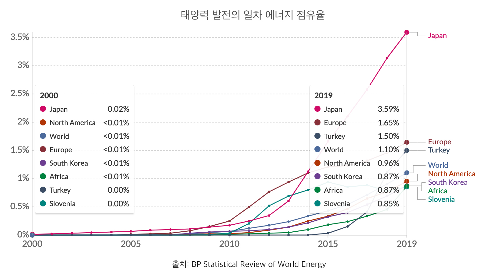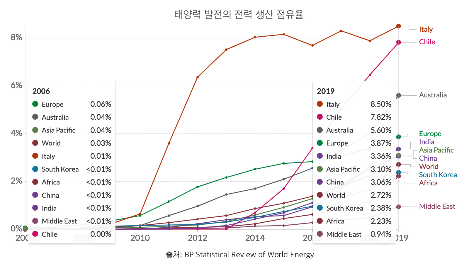 아래 도표는 태양력 발전이 본격화 된 2006년 부터 2019년 사이 전 세계와 주요 지역 및 국가들의 태양력 발전이 전력 생산에서 차지하는 점유율의 변화를 보여준다. 전 세계적으로 태양력은 2006년 전체 전력 생산의 0.03%에 불과했지만 2019년에는 2.72%로 증가했다. 가장 빠른 속도로 태양열 발전이 성장한 곳은 이탈리아와 칠레, 호주다. 이들은 같은 기간 동안 태양력 발전 점유율이 0.01% 미만에서 각각 8.50%, 7.82%, 5.60%로 성장했다.
