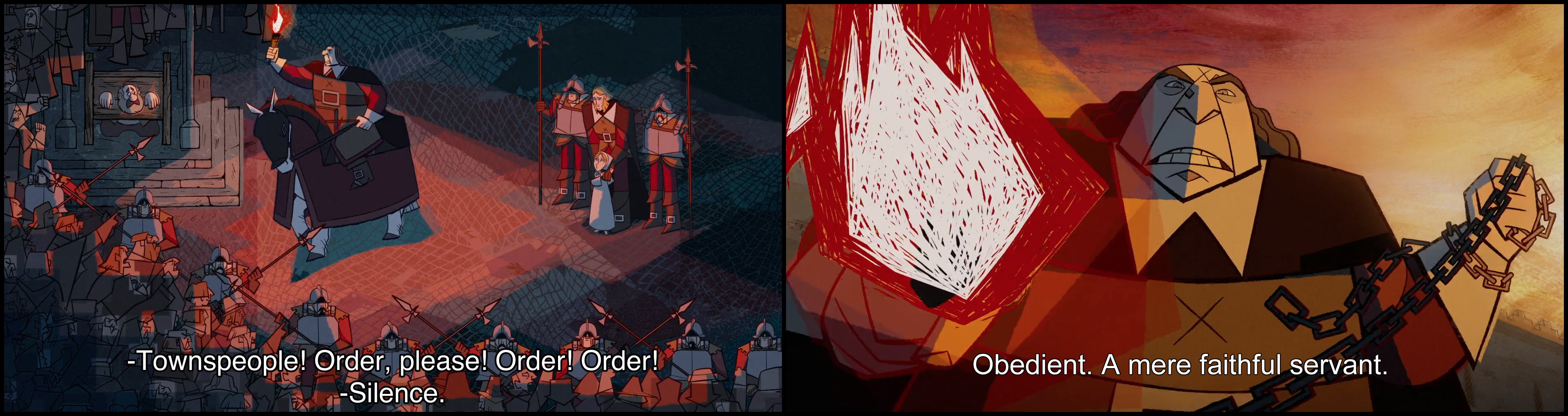 두 번째 대립과 대비는 각과 원이다. 성과 도시는 늘 각져 있고, 숲은 둥그렀다. 성 내부의 건물들과 도로는 뾰족한 각과 직선을 이루고 있지만, 숲의 나무는 둥그렇고, 숲길은 굽어져 있다. 더구나 숲에서 본 성과 도시는 입체감이라고는 전혀 없는 그저 벽에 그려진 네모처럼 생기가 없다. 또 다른 선의 대립은 캐릭터를 통해 표현된다. 탐욕스러운 인간을 형상화한 호국경과 넉넉한 자연을 상징하는 울프워커인 메브의 엄마 몰(Maria Doyle Kennedy 목소리)은 완전히 다른 선의 형태를 가진다. 권력의 상징인 호국경은 각진 얼굴과 각진 갑옷으로 자신의 몸을 두르고 있지만, 몰은 둥그런 머리에 둥그런 몸을 가지고 있다. 이 선의 대립은 도시와 숲, 문명과 자연의 대비다.