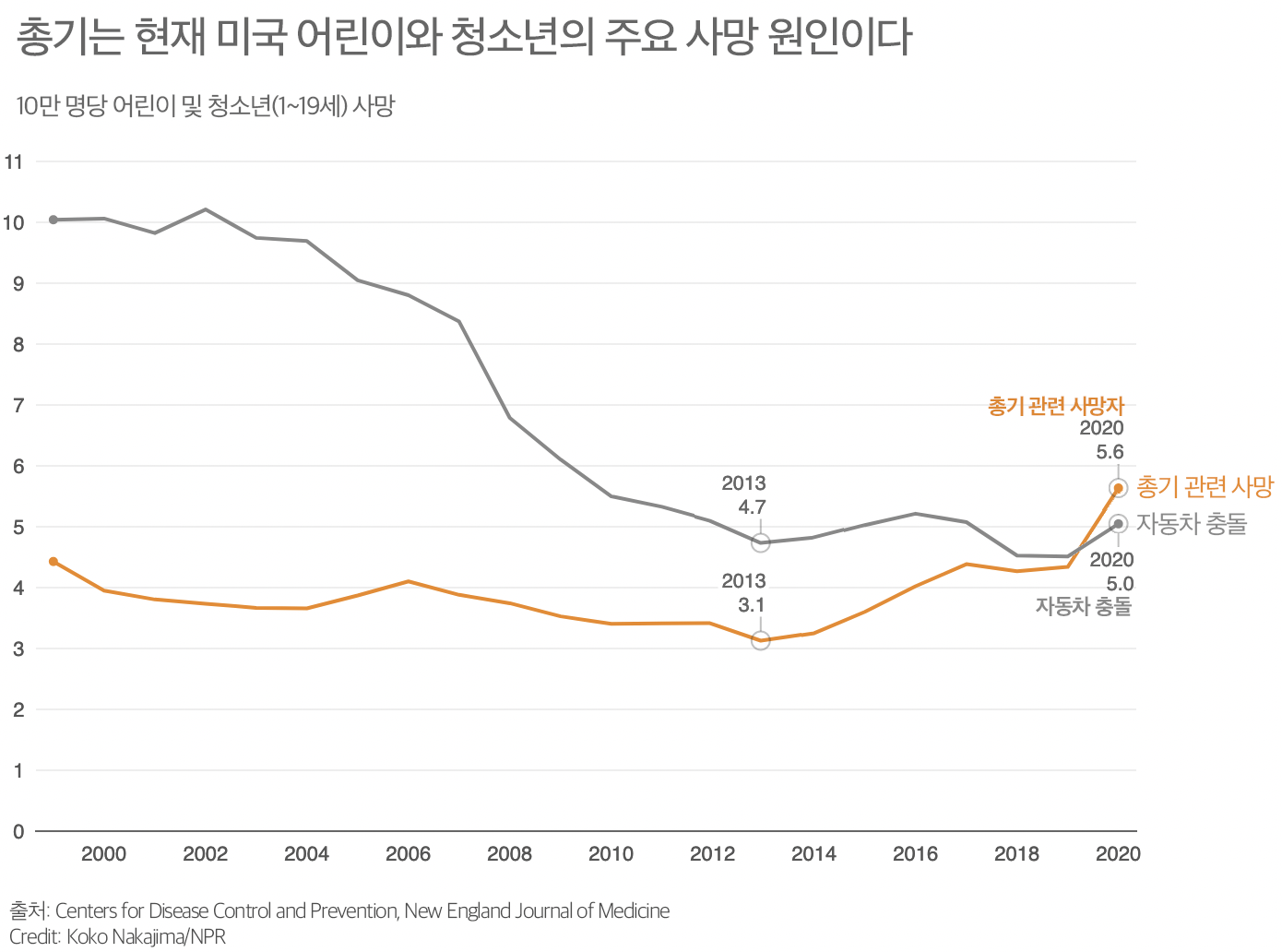 수십 년 동안 자동차 충돌은 1세에서 19세 사이의 미국인의 주요 사망 원인이었다. 그러나 자동차 충돌 사망과 총기 사망 사이의 격차는 최근 몇 년 동안 꾸준히 줄어들기 시작했다. 2020년에는 총기 폭력이 자동차 사고를 제치고 미국 어린이 및 청소년의 사망 원인 1위가 되었다.