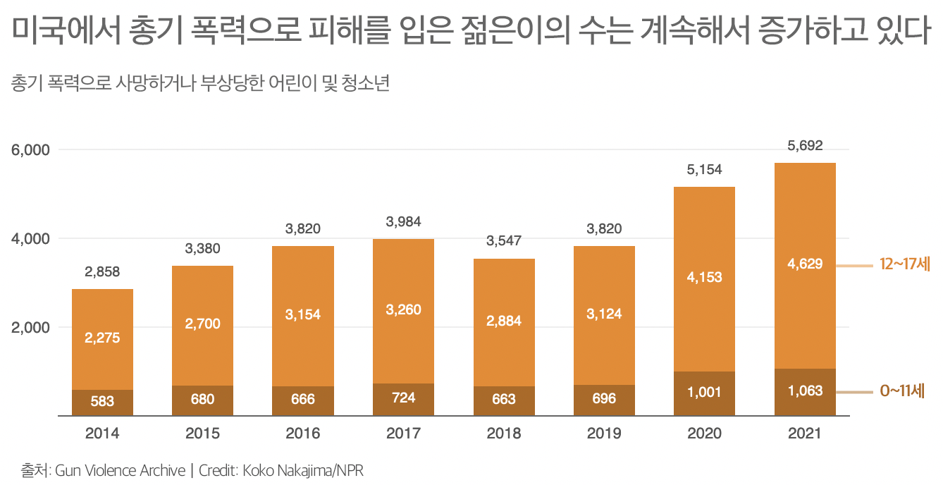 총기 폭력 아카이브(Gun Violence Archive)에 따르면 5년 전만 해도 4,000명 미만의 어린이와 17세 이하 청소년이 총기 폭력으로 죽거나 다쳤다. 지난해 말까지 그 숫자는 43% 증가한 5,692명이었다. 이 어린이와 청소년 중 약 1,560명이 사망했다.