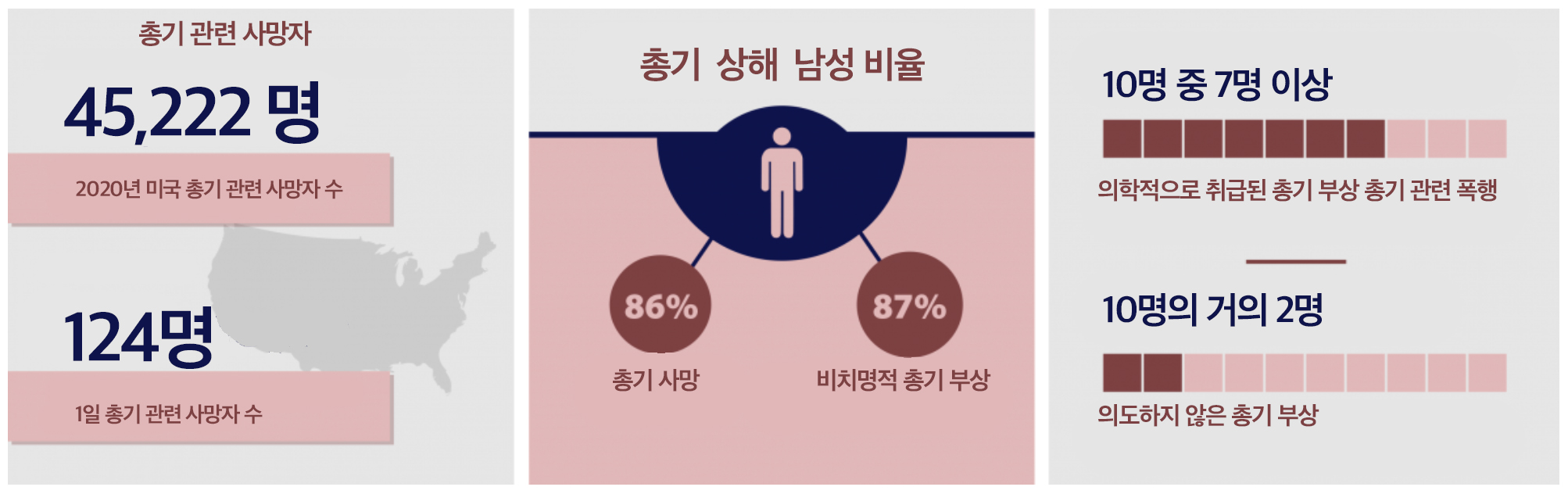 총기 상해는 삶의 모든 단계에서 사람들에게 영향을 미친다. 2020년에 총기 관련 상해는 미국에서 1-44세 사이의 주요 사망 원인 5가지 중 하나였다. CDC에 따르면 2020년 미국에서 총기 관련 사망자는 45,222명으로 하루에 총기 관련 상해로 약 124명이 사망했다. 총기 관련 사망의 절반 이상이 자살이었고 10명 중 4명 이상이 총기 살인이었다.