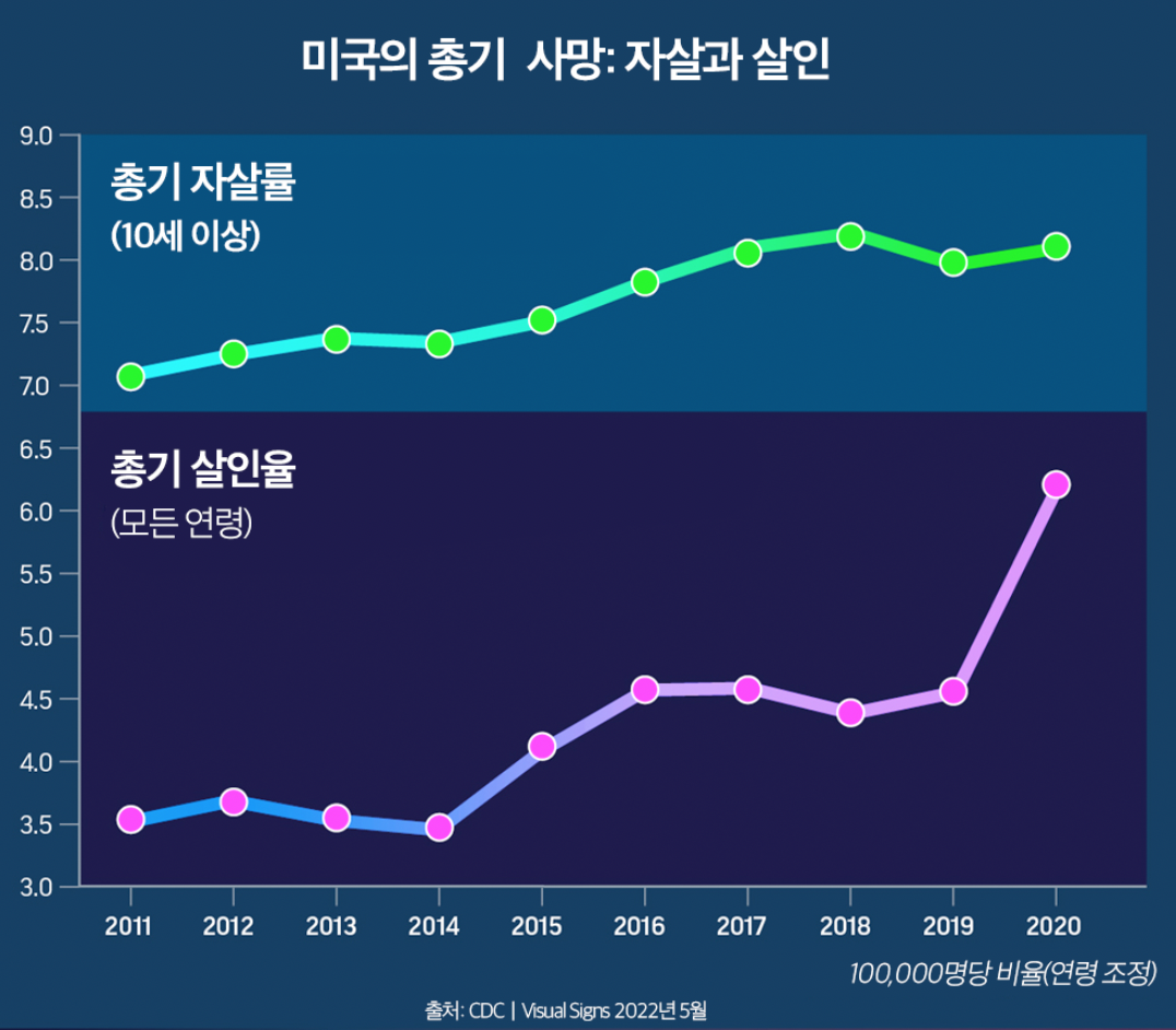 사람들의 이목을 끄는 총기 난사 혹은 대규모 총격 사건은 총기로 인한 전체 사망자 수의 1%에 불과하며 나머지는 자살과 사고, 범죄행위 중 발생한 총기 관련 사건이다. 그중 자살의 비율이 54%로 가장 높다. 미국 CDC에 따르면 2019년부터 2020년까지 총기 살인율은 10만 명당 4.6명에서 6.1명으로 약 35% 증가했다.