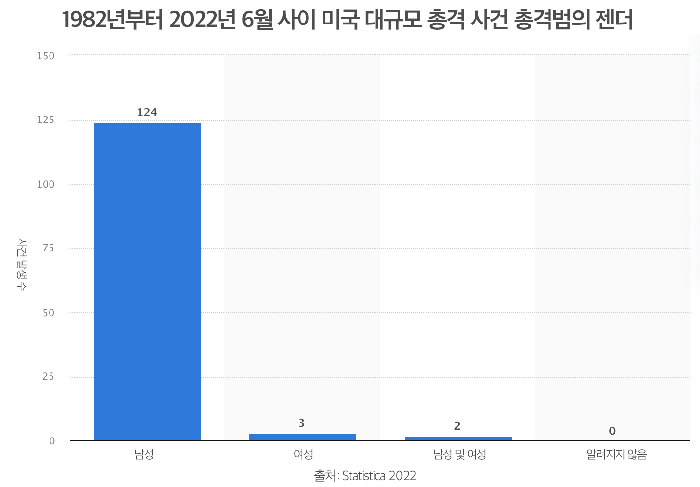 총기 관련 폭력은 통계적으로 볼 때 마초적 폭력이다. 총기 폭력 희생자의 대부분이 남성들이 뿐만 아니라 그 가해자 역시 압도적으로 남성이다. 1982년~2022년 사이 미국에서 발생한 총기 난사 사건 가해자의 124명이 남성인데 비해 여성 가해자는 3명에 불과했다.