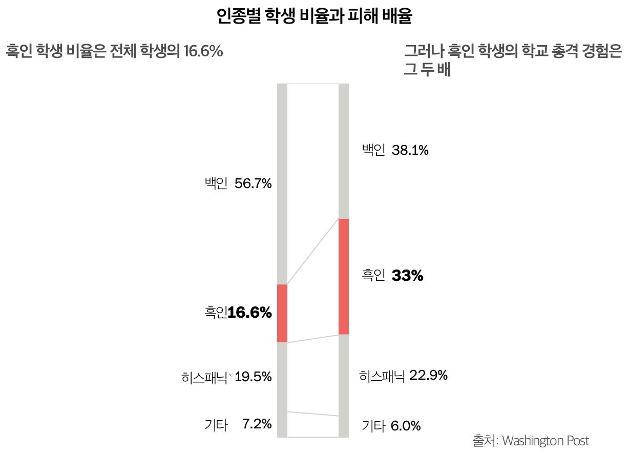 각 인종 일반보다 학생으로 폭을 좁혀도 흑인의 총격에 의한 사망과 피해는 인구비율로 볼 때 높은 편이다. 워싱턴 포스트의 데이터베이스에 따르면 미국 전체 학생 수에서 흑인 학생의 비율은 16.6%지만 학교 총격으로 피해를 입은 흑인 학생의 비율은 그 두배인 33%로 학교 총격 사건의 인종적 측면을 보여준다.