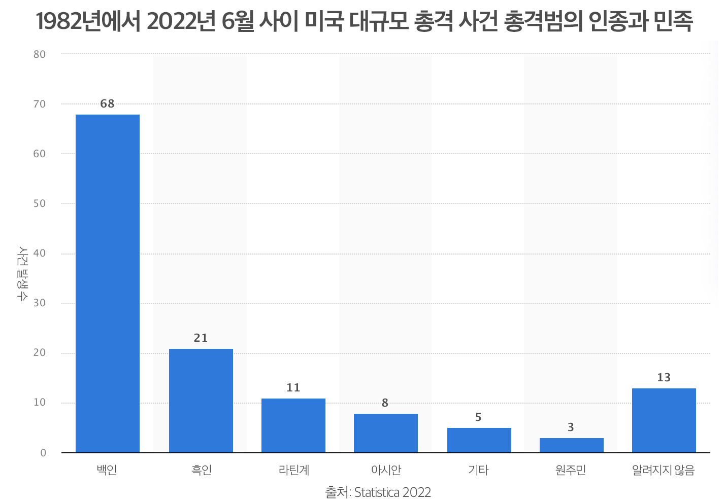 1982년 이후 총기 난사 사건 혹은 대량 총격 사건(총격범을 제외한 4명 이상의 사상자 발생 사건)의 가해자 혹은 총격범의 52.7%가 백인이며, 흑인의 비율은 16.2%에 불과하다.