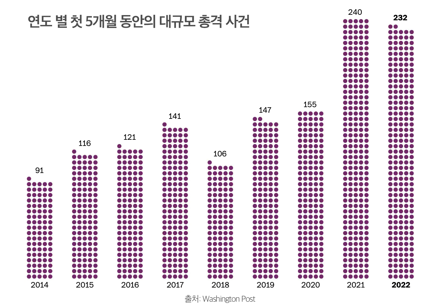 워싱턴 포스트에 따르면 2021년과 2022년 사이 총격범을 제외한 4명 이상의 사상자가 발생한 대규모 총격 사건은 각각 240건과 232건으로 코로나19로 봉쇄와 사회적 거리가 한창이던 2019년의 155건보다 훨씬 급증했다.