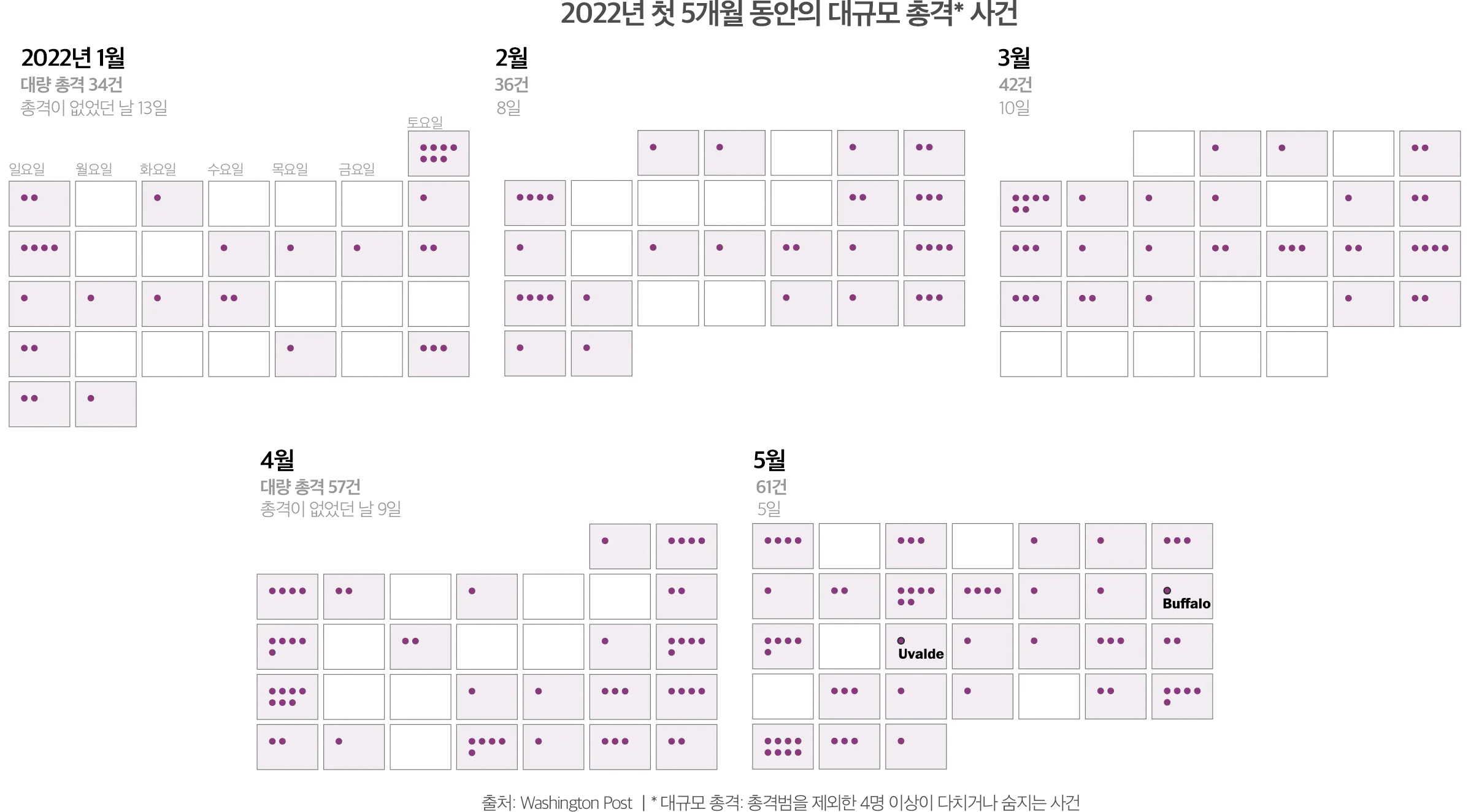 아래 2022년 1월~5월까지의 대규모 총격 사건 발생 시기 도표를 보면 월별 대규모 총격 건수가 조금씩 증가하는 것을 볼 수 있다. 대량 총격 사건이 34건 있었던 1월에 총격이 없었던 날은 13일이지만 5월 달에는 모두 61건의 총격 사건이 발생하였으며 총격이 발생하지 않았던 날은 5일에 불과했다.