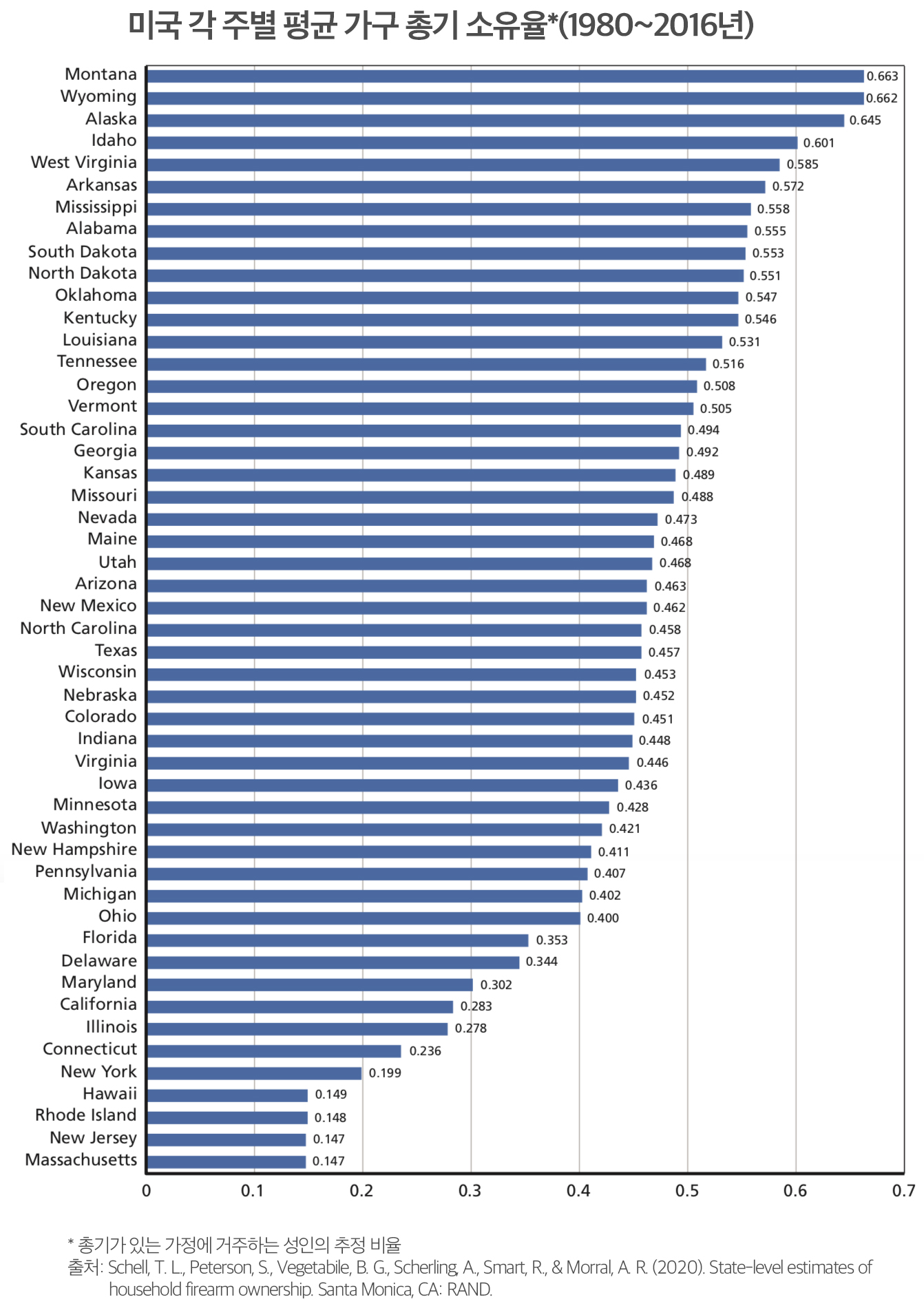 아래의 미국 싱크탱크 RAND 연구소의 1980~2016년 각 주 가구별 총기 소유율을 차트를 보면 몬태나, 와이오밍, 알래스카의 총기 소유율이 가장 높은 반면 하와이, 로드 아일랜드, 뉴저지 및 매사추세츠는 가장 낮은 것으로 나타났다. 이 자료를 위의 기퍼즈 각 주별 총기 규제 순위와 등급 및 총기 사망률 도표와 비교하면 가구별 총기 소유율이 높은 몬태나, 와이오밍, 알래스카의 총기규제 등급은 모두 F이며 총기로 인한 사망률 순위는 상위권임을 알 수 있다. 반면에 가구별 총기 소유율이 가장 낮은 하와이, 로드 아일랜드, 뉴저지 및 매사추세츠의 총기 규제 등급은 A에서 B사이로 높았고 총기 사망률은 매우 낮았다. 이는 총기 소유율이 높을수록 총기 사망률이 높으며, 총기 소유율과 총기 사망 사이의 높은 상관성이 있음을 보여준다.