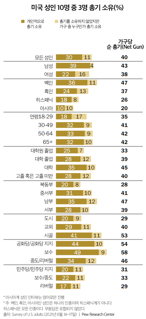 미국 총기 소유와 관해 언론과 연구자들에 의해 가장 빈번히 인용되는 2021년 6월 퓨 리서치 센터(Pew Research Center) 설문 조사에 따르면 미국 성인 10명 중 4명은 총기를 소유한 가정에 살고 있으며 30%는 개인적으로 총을 소유하고 있다고 밝혔다.