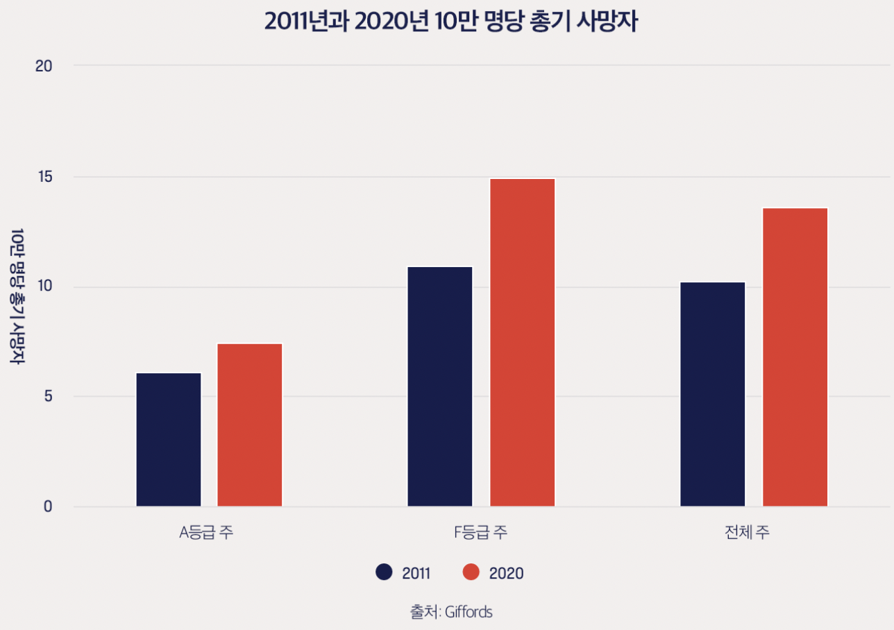 2011년과 2020년의 A등급 주와 F등급 주의 총기에 의한 사망자 수를 비교하면 A등급 주는 2011년 10만 명당 6.1명에서 7.4명으로 소폭 증가했지만, F등급 주들은 10.9명에서 14.9명으로 대폭 증가했다.