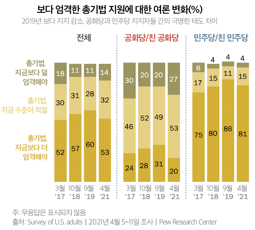 미국 팩트 기반 전문 싱크탱크인 퓨 리서치 센터(Pew Research Center) 센터의 2021년 4월 설문조사에 따르면 미국인의 약 절반(53%)이 더 엄격한 총기법을 지지하는 것으로 나타났지만 이는 2019년 60%에 비해 감소한 것이다. 추세적으로 미국은 총기에 대해 더 강경하기보다는 더 느슨한 태도가 증가하고 있다. 이는 공화당과 민주당 지지자들은 더 엄격한 총기 규제에 대해 각각 20%와 80%의 지지로 극명한 차이를 드러내는데 총기 규제에 대한 이러한 정파적 차이는 총기 규제에 대한 초당적, 연방 차원의 합의를 끌어내기 더욱 어렵게 만들고 있다.