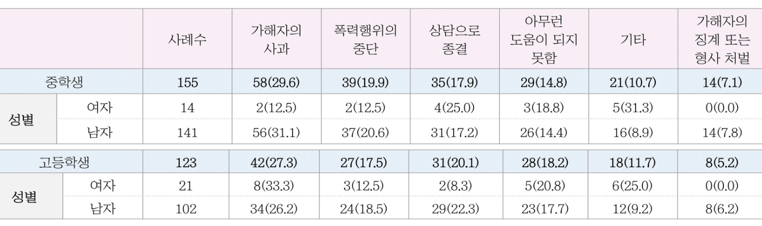 이러한 학생 선수들의 소극적 대응과 폭력피해의 내면화는 폭력을 용인하는 학교체육의 환경과 무관하지 않다. 위의 도표에서 보듯이 중등과 고등의 신체폭력 사례 수는 약 3,000건에 달하지만 도움을 요청하는 경우는 155건에 불과했다. 그나마도 상담으로 종결되거나, 아무런 도움이 되지 못하거나, 혹은 간단한 조치나 역효과가 난 경우 중등은 43.4%, 고등은 50%에 이른다. 가해자에 대한 징계 또는 형사처벌의 비율이 극단적으로 낮은 환경에서 가해자의 사과나 폭력행위의 중단은 사태의 일시적 해결로 그칠 가능성이 높으며, 학생 선수에 대한 지도자 혹은 선배나 또래집단의 폭력은 집단 내에서 끊임없이 사회화되고 재생산될 수 있다.