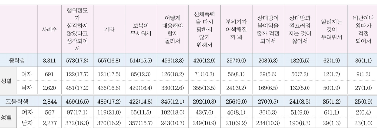 신체폭력에도 불구하고 소극적 대응 비율이 압도적으로 높은 이유는 그 정도가 경미하다고 생각되는 경우도 있지만 적지 않은 경우 어떻게 대응해야 할지 모르거나, 보복이 두렵기 때문이다. 특히 여성 학생 선수들의 경우는 어떻게 대응해야 할지 모르는 경우가 남성보다 6~8% 정도 높았으며, 남성 학생 선수들은 보복이 무섭기 때문에 소극적으로 대응하는 비율이 여성보다 4% 정도 높았다.