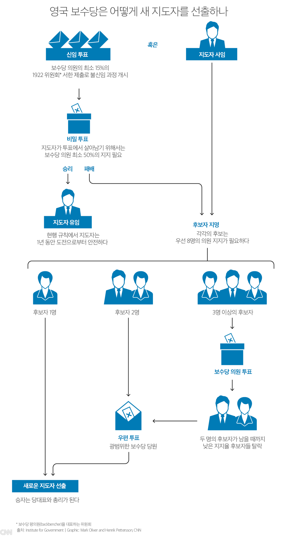 역자 주: 아래는 CNN이 영국 보수당의 새로운 지도자 선출과정을 정리한 그래픽이다.