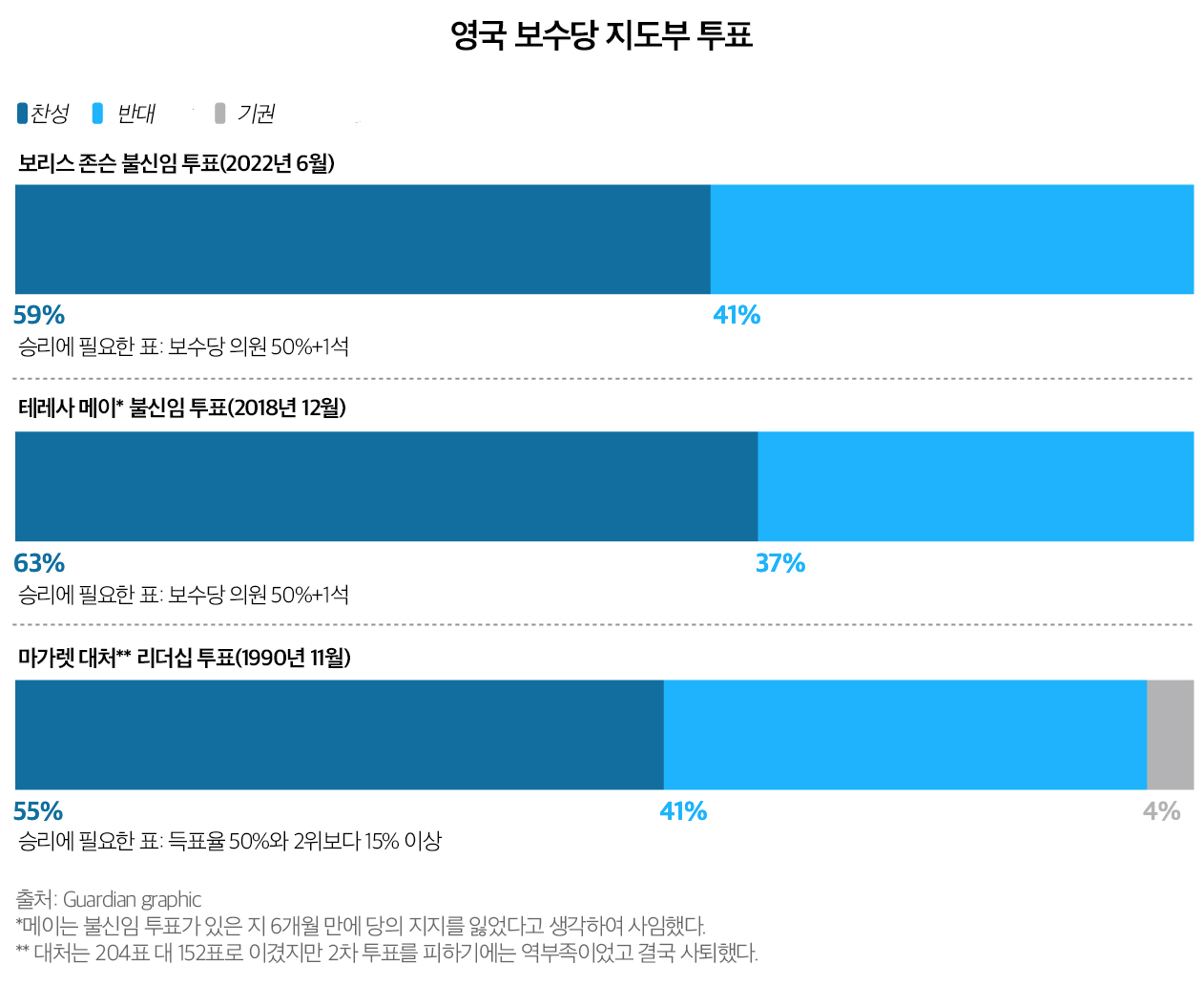 * 역자 주: 보수당 신임투표의 역사를 보면 비록 지도자가 불신임 투표에서 승리한다 하더라도 그와 그의 당은 치명적인 내상을 입었다. 보수당 지도자에 대한 신임 투표는 지난 32년 동안 모두 3번 있었다. 첫째로 마이클 헤셀틴(Michael Heseltine) 내무장관이 1990년 경선 1차 투표에서 대처의 리더십에 도전했을 때 그는 40.9%의 득표율을 얻었고, 대처는 당시 운영되는 규칙에 따라 완승에 필요한 55%를 달성하지 못했기 때문에 2차 투표에 임해야 했다. 처음에 그녀는 그녀가 계속 싸울 것이라고 선언했지만 결국 물러나고 존 메이저(John Major)가 선출되었다. 두 번째는 메이저가 유럽연합에 반대하는 당내 목소리를 잠재우기 위하여 1995년 자신에 대한 신임투표를 요구했을 때이다. 그는 그의 의회 동료들의 71%의 지지를 얻어 큰 표차로 이겼다. 하지만, 결국 유권자들의 눈에 보수당은 분열된 것으로 비쳤고 결국 2년 뒤 토니 블레어가 이끄는 노동당에 보수당은 대패하고 말았다. 세 번째는 2017년 총선에서 의회 과반수 의석을 차지하지 못한 메이 총리가 2019년 봄 실시한 신임투표다. 그녀는 63%의 하원의원의 지지를 얻음으로써 기대 이상의 성과를 거두었다. 하지만, 그녀는 하원이 받아들일 수 있는 브렉시트의 해결책을 찾는 문제를 해결하지 못함으로써 승리에도 불구하고 6개월 만에 사임했고 지금의 보리스 존슨이 그녀를 대체했다. 6월 23일 웨이크필드와 호니튼과 티버튼에서 곧 열릴 보궐 선거를 앞둔 보수당의 전망은 매우 흐리다. 두 의석 모두 지난 선거에서 보수당이 이겼지만 최근 여론 조사에 따르면 한 곳은 노동당이 확실한 우위에 있고 다른 한 곳은 자유당으로 넘어갈 것이라는 전망의 우세하다. 이대로라면 2024년 총선에서 보수당이 5번째 승리를 거두기는 어려울 것이다. 존슨에 대한 불신임 투표는 결과를 떠나 그것이 제기되었다는 것만으로도 그와 보수당에 큰 타격이다. 이 글은 Guardian의 정치 부편집자 Rowena Mason의 6월 7일 자 기사 Boris Johnson wins no-confidence vote despite unexpectedly large rebellion의 번역으로 존슨의 불신임 투표 승리의 불완전성과 불안정성 그리고 이 불안한 승리의 의미를 분석하고 있다.