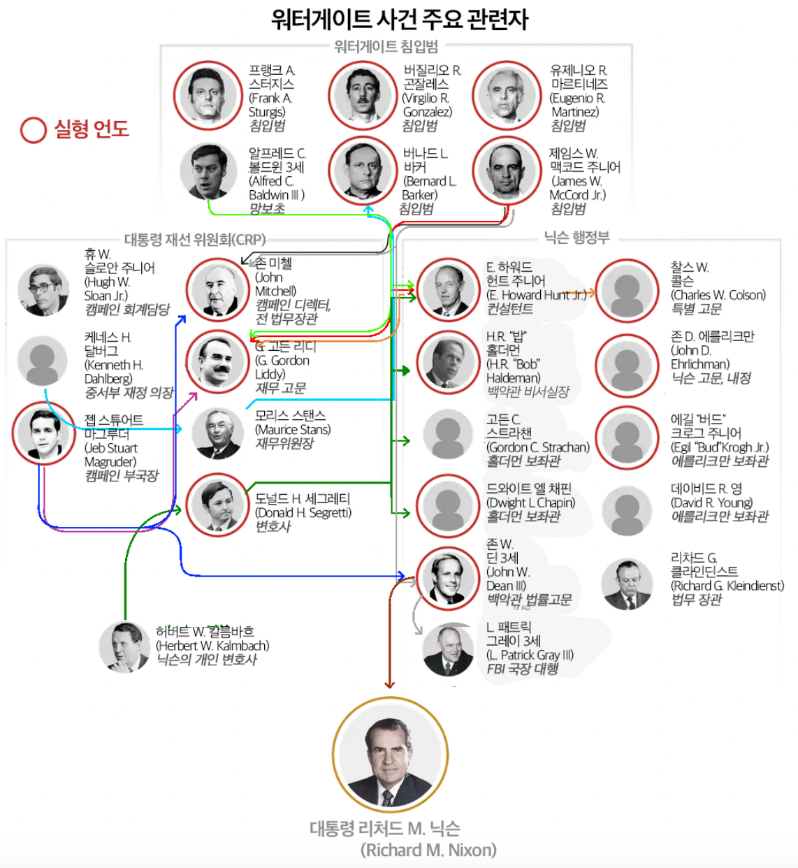197년 대통령 닉슨은 베트남에 대한 미국의 개입을 기록한 펜타곤 문서를 폭로한 대니얼 엘즈버그를 도덕성에 타격을 가하기 위해 비밀공작팀의 조직을 승인한다. 이 팀은 엘즈버그의 정신과 의사 사무실에 들어가 그의 진단서를 훔치려 했다. 후에 '배관공'이라 불리게 된 비밀공작팀은 1년 뒤 정부의 지원 아래 워터게이트(Watergate)에 있던 민주당 전국위원회에 도청을 시도한다. 1972년 워싱턴 D.C.의 호텔 겸 사무실 건물인 워터게이트에서 민주당 전국위원회 본부를 도청하려던 남성 5명으로 구성된 이 배관공들이 체포되면서 미국 역사에서 가장 추악했던 워터게이트 스캔들이 본격적으로 터지게 된다. 닉슨과 그의 측근들은 불법 정치자금을 동원하여 상대당에 대한 정치공작과 감시를 하고, 공권력을 동원하여 이러한 공작을 비호하고, FBI의 수사를 방해하고, 백악관의 통화 녹음테이프를 왜곡하고, 국민 여론을 조작하고, 의회가 임명한 워터게이트를 조사하던 특별 검사를 해임하여 의회 정치를 부정하는 등 국가 기구 전반을 자신의 권력유지와 정적의 탄압을 위해 부당하게 동원했다.