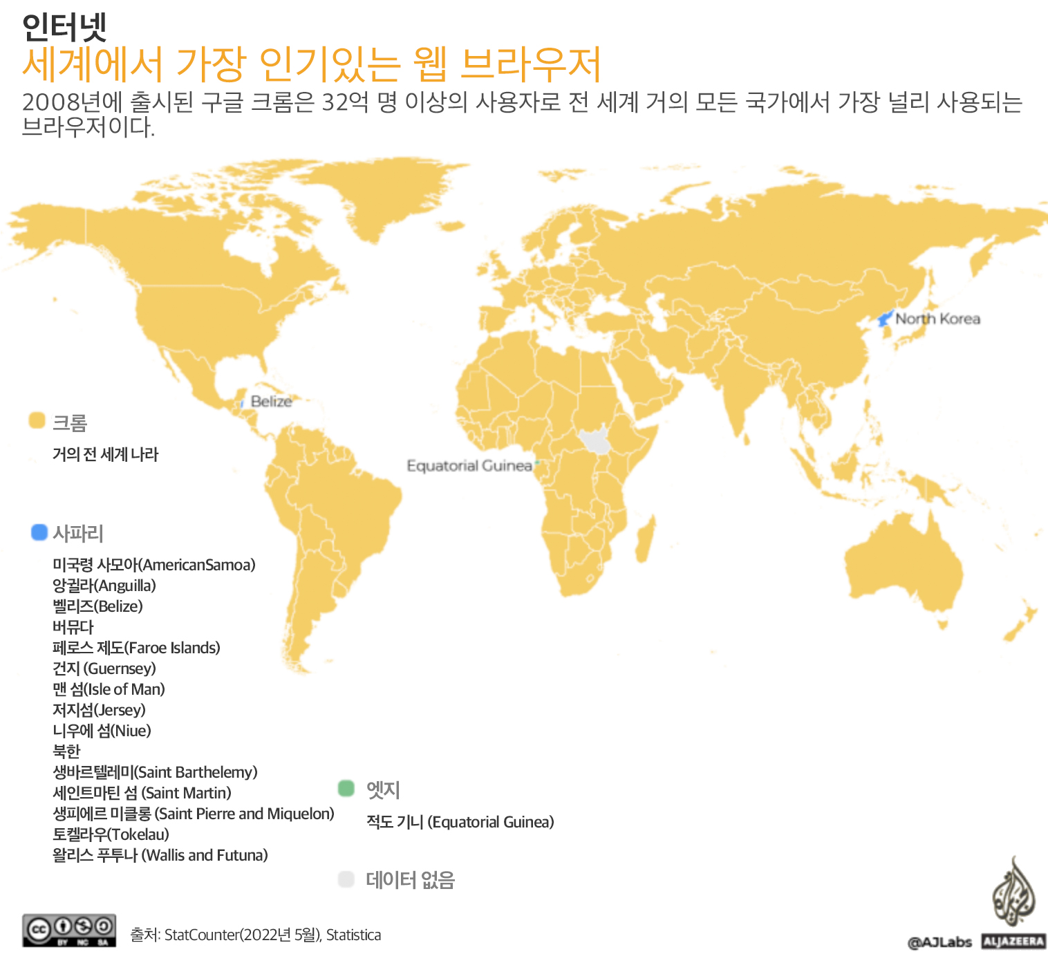 StatCounter에 따르면 전 세계 거의 모든 국가에서 구글 크롬이 가장 널리 사용되는 브라우저이다.
