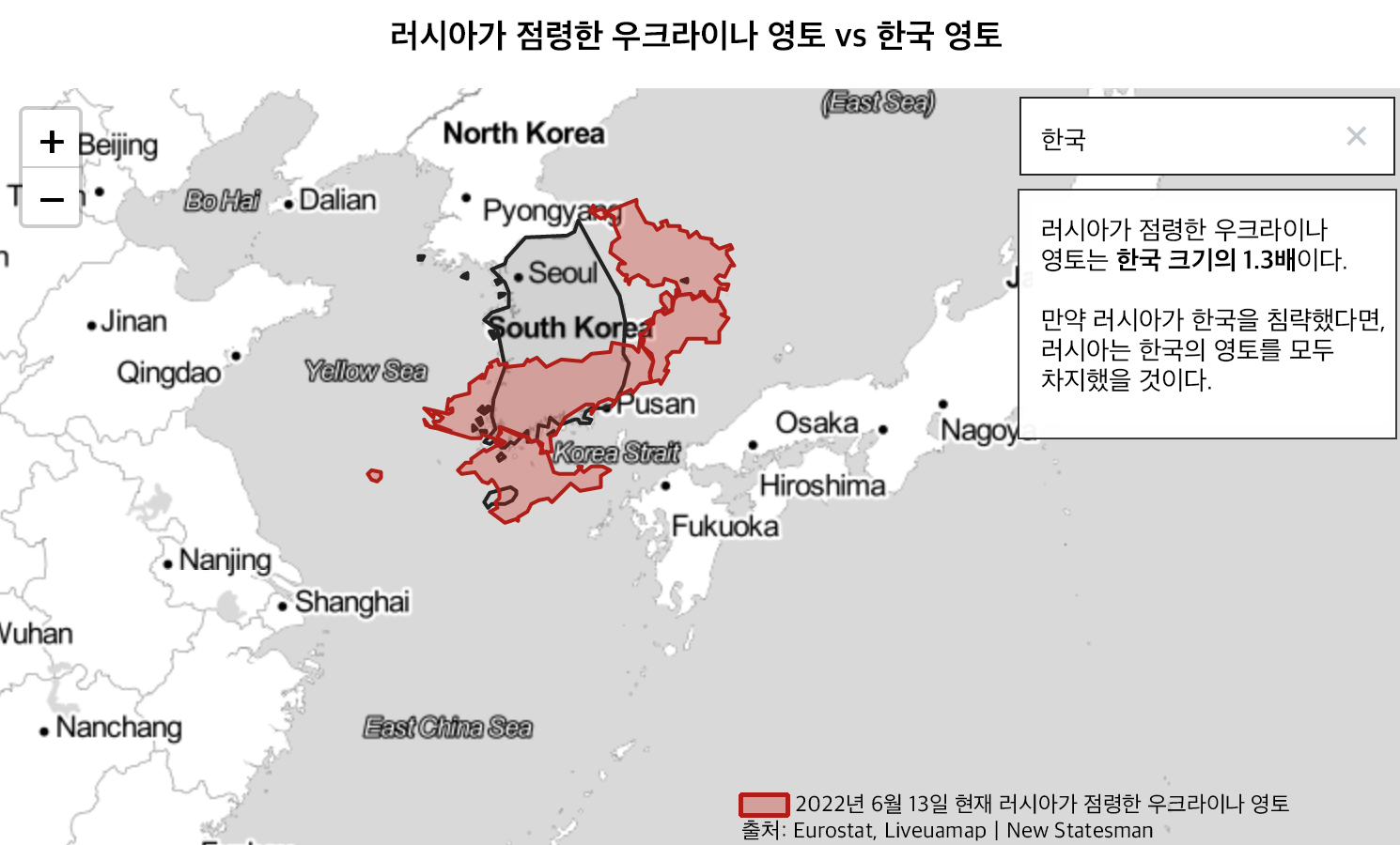 우크라이나가 상실한 면적의 크기를 구체적으로 이해하기 위해서는 비교가 도움이 된다. 한국의 면적은 100,210 km²로 6월 13일 현재 러시아가 점령한 우크라이나 영토 126,645 km² 는 한국 면적의 약 1.3배에 해당한다.