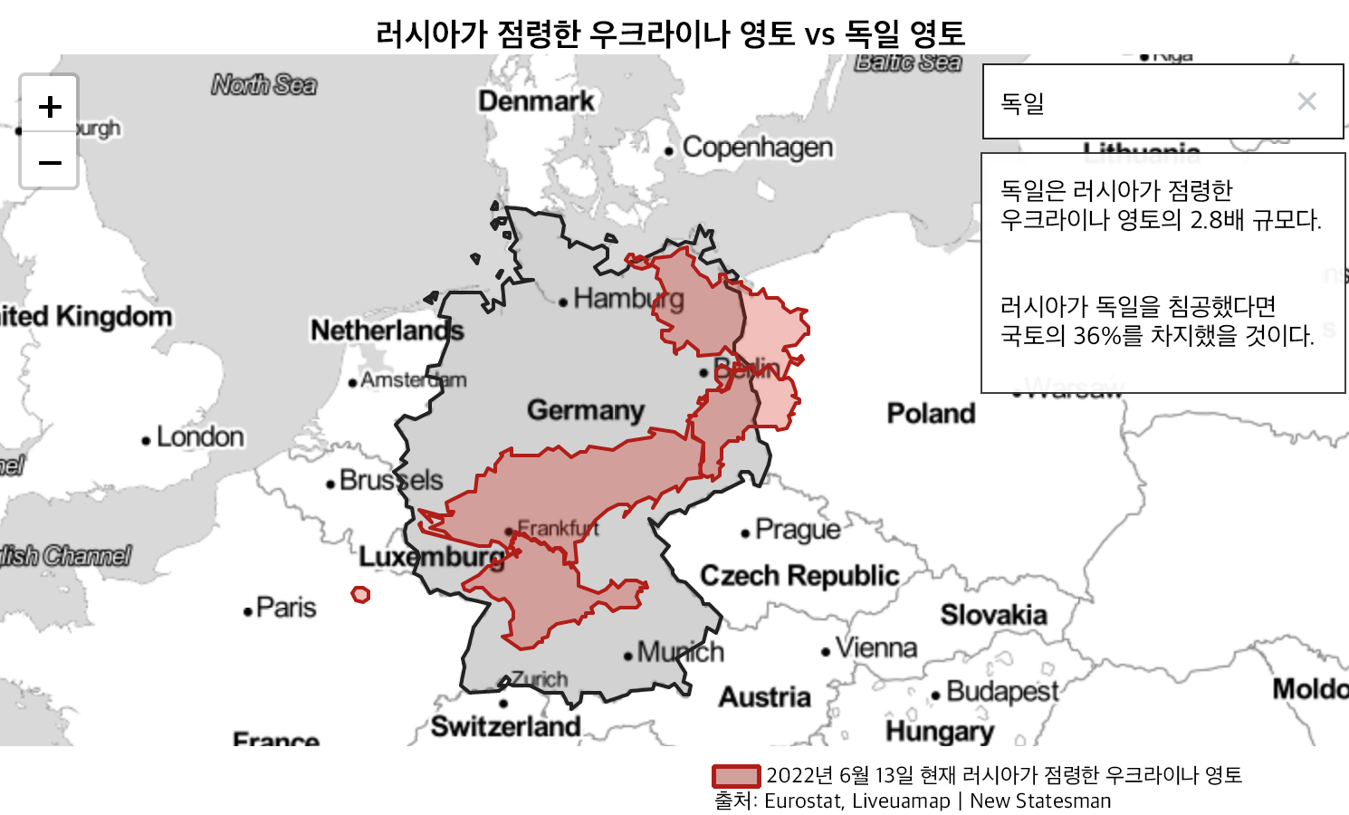 석유와 가스 자원 등 에너지를 러시아에 크게 의존해 대 러시아 제재에 소극적이었던 독일의 면적은 357,588 km²로 러시아가 점령한 우크라이나의 지역은 독일 영토의 3분의 1 이상(36%)이다.