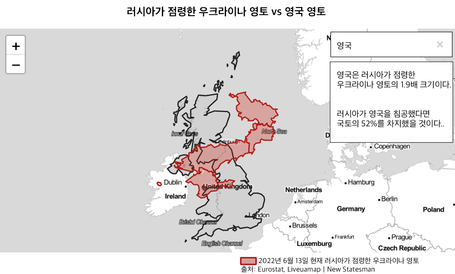 영국 면적은 243,610 km²로, 러시아가 점령한 우크라이나 영토는 영국 영토의 절반 이상(52%)에 해당한다.