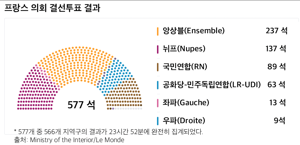 초기 결과에 따르면 프랑스 대통령 연합 앙상블!(Ensemble!)*은 현재 차지하고 있는 346석과 비교해 총선 이후 230석을 얻는 데 그칠 예정이다.
