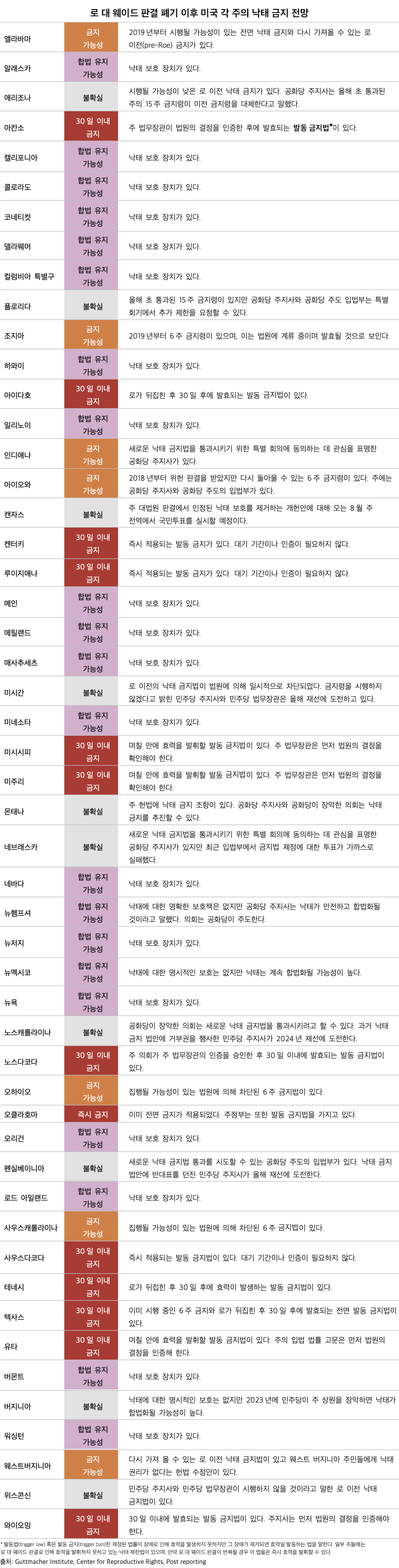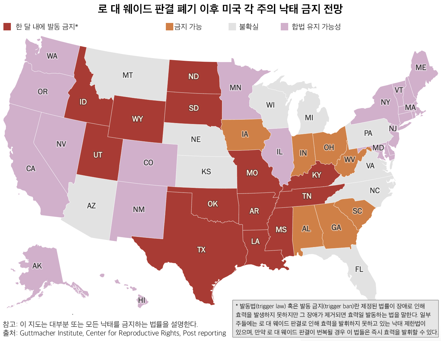 ** 역자 주: 발동법(trigger law)이란 제정된 법률이 장애로 인해 효력을 발생하지 못하지만 그 장애가 제거되면 효력일 발동하는 법을 말한다. 일부 주들에는 로 대 웨이드 판결로 인해 효력을 발휘하지 못하고 있는 낙태 제한법이 있으며, 만약 로 대 웨이드 판결이 번복될 경우 이 법들은 즉시 효력을 발휘할 수 있다.