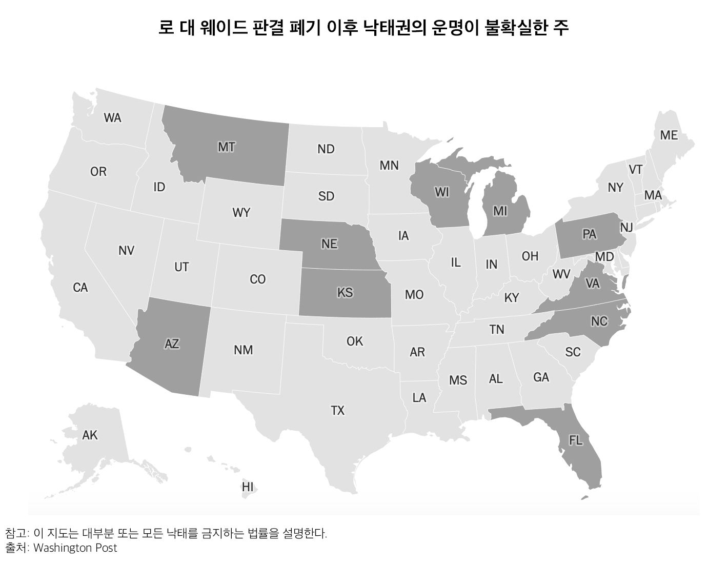 ■ 역자 주: 미국 대법원은 6월 24일 연방차원에서 여성의 낙태권을 보장해온 1973년 대법원의 로 대 웨이드(Roe v Wade) 판결을 뒤집었다. 지난해 5월, 대법원은 미시시피주 보건부(현재 장관은 Thomas Dobbs)가 주의 유일한 낙태 클리닉인 잭슨 위민스 헬스 오가니제이션의 운영이 임신 15주에 대부분의 낙태를 불법화하는 주의 법에 반한다며(로 대 웨이드 판결에서는 24주까지 낙태 가능) 대법원에 요청한 심의를 수용했다. 미시시피 주는 로 대 웨이드의 핵심 신조 중 하나를 위반하여 태아의 자가 생존력 이전 낙태 금지(pre-viability abortion ban) 허용을 대법원에 요청했을 뿐만 아니라 로와 케이시 판결을 완전히 기각할 것을 대법원에 요청했다. 돕 대 잭슨 위민스 헬스 오가니제이션(Dobbs v Jackson Women’s Health Organization) 케이스로 알려진 이번 판결로 절반 이상의 주들이 낙태를 금지할 수 있게 되었다. 모든 생식 연령의 미국 여성들 중 절반 이상(58%), 즉 4천만 명이 낙태에 반대하는 주에서 살고 있기에 이는 수천만 명의 미국인들에게 즉각적인 영향을 미칠 것이다. 이번 판결은 절반 가량의 주에서, 특히 남부와 중서부 대부분 지역에서 낙태를 불법으로 만들 것이다. 이 주들에서, 임신할 수 있는 여성과 다른 사람들은 낙태 제공자에게 접근하기 위해 수백 마일을 여행하거나, 약물이나 다른 방법을 통해 집에서 낙태를 스스로 관리해야 한다. 이 판결은 낙태뿐만 아니라 자유, 자기 결정, 그리고 개인의 자율성에 대한 국가적 이해를 지울 수 없을 정도로 변화시킬 것이다. 경향적으로 그리고 역사적으로 법원은 더 많은 권리를 부여하기 위해 사건을 뒤집었으나 트럼프에 의해 대법원의 보수 세력이 압도적 우위를 차지한 이후 이 역사적 흐름은 바뀌었다. 이 새로운 판결은 폴란드, 엘살바도르, 니카라과와 함께 미국을 1994년 이후 낙태권을 철회한 리를 철회한 단 4개국 중 하나로 만들었다. 돕 대 잭슨 위민스 헬스 오가니제이션의 판결을 다시 폐기할 수 있는 방법은 연방차원의 낙태법을 제정하는 것이지만 현재 상하원을 비교적 고르게 분점하고 있는 상황에서 특히 연방 차원의 법 통과를 위해 상원의 60표 이상이 필요하고 낙태를 반대하는 공화당의 지지가 필수적인 상황에서 거의 불가능한 것으로 여겨진다. 이번 중간 선거가 그 흐름에 일정한 영향을 줄 수 있을 지라도 낙태 의료 서비스를 거부당한 채 출산을 강요당하는 개인의 삶에 이번 판결은 지울 수 없는 부정적인 영향을 남길 것이다. 이 글은 Washington Post 6월 24일 자 기사 Abortion will soon be banned in 13 states. Here’s which could be next.의 번역으로 대법원의 로 대 웨이드 판결 폐기 이후 미국 각 주별 낙태권 폐기, 악화, 유지, 강화 전망에 대해 분석하고 있다.