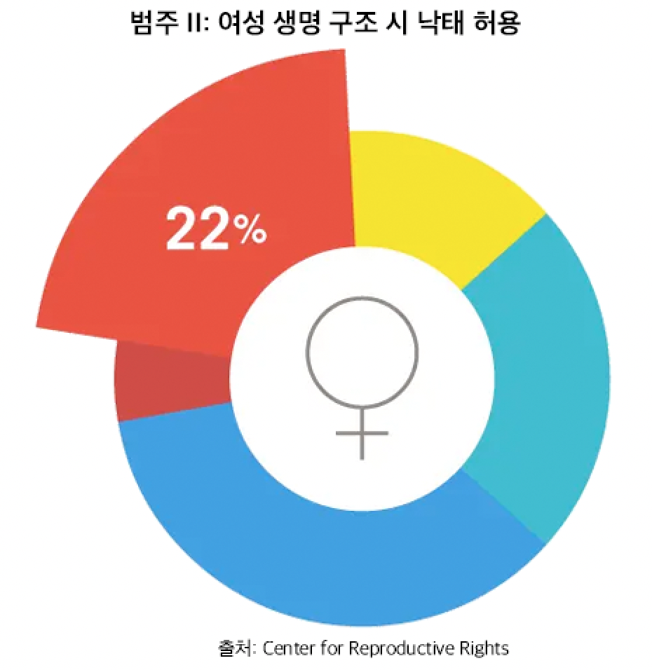 두 번째 범주는 여성의 생명이 위험할 시 그 구조를 위해 낙태를 허용하는 국가로 42개국이 이 범주에 속한다. 여성의 생명을 구하기 위해 낙태를 허용하는 나라에는 전 세계 생색 연령의 22%인 3억 6천만 명의 여성이 살고 있다.