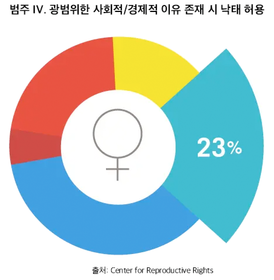 네 번째 낙태 허용 범주는 광범위한 사회적 또는 경제적 이유가 존재하는 경우이다. 이러한 국가에서는 임신과 출산의 잠재적 영향을 고려할 때 여성의 현재 또는 합리적으로 예측 가능한 환경과 사회적 또는 경제적 상황을 고려하는 경우가 많다. 전 세계 생식 연령기 여성의 23%인 3억 8,600만 명이 광범위한 사회적, 경제적 이유로 낙태를 허용하는 나라에 살고 있다.