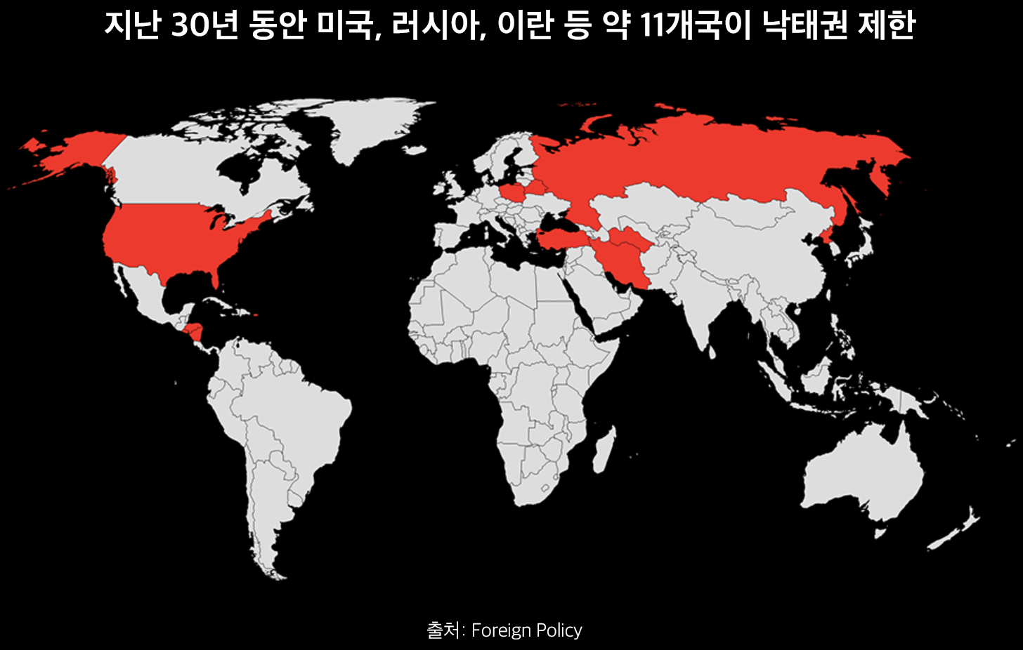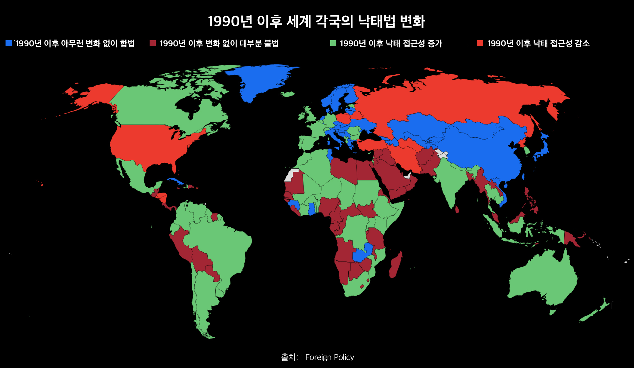 1990년 이후 각국의 낙태법 변화는 아래 지도에서 볼 수 있다. 한국은 2020년 헌법재판소의 판결에 따라 낙태를 비범죄화하면서 뒤늦게 낙태권 확대 대열에 합류했다.