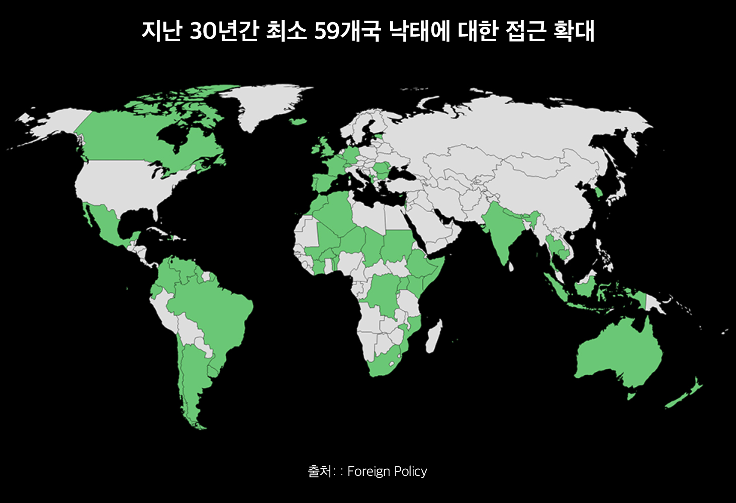 전 세계적으로 보면 지난 30년간 59개국에서 낙태에 대한 접근이 확대되었다. 이 나라들에는 콜롬비아, 아르헨티나, 그리고 한국과 같은 나라들이 포함된다.