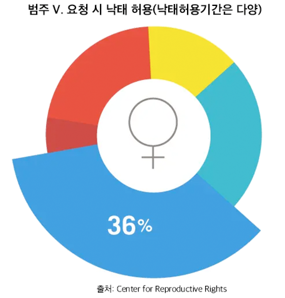 아래 도표는 유엔 경제사회국(United Nations Department of Economic and Social Affairs, UN DESA)의 2019년 자료로 세계 각국의 낙태가 법적으로 허용되는 조건과 임신 기간을 정리한 것이다.