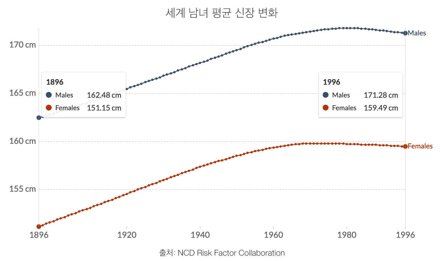 아래 도표는 1896년부터 1996년 사이 출생한 사람들이 18세에 도달했을 시점, 즉 1914년~2014년 사이의 평균 신장이다. 1996년에 태어난 성인 남성이 만 18세가 된 2014년과 한 세기 전인 1896년 태어난 성인 남성이 만 18세가 된 1914년 남성의 세계 평균 신장은 162cm에서 171cm(cm)로 증가했다. 같은 기간. 여성의 경우, 평균신장이 151cm에서 159cm로 증가했다. 오늘날 성인들의 평균 신장은 1백 년 전보다 약 5%가 크다.