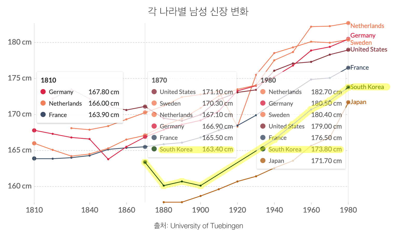 네덜란드 남성의 키는 1810년~1980년 사이 16.7cm, 독일은 12.7cm만큼 증가했다. 미국 남성의 평균 신장은 1870년~1980년 사이 약 8cm 증가했다. 한국 남성의 키는 1870년 163.4cm에서 19세기 말까지 급속히 감소했으나 20세기 들어 지속해서 증가해 1980년에는 173.8로 약 10cm 증가했음을 알 수 있다. 세계 각국의 이러한 신장 증가는 건강과 영양 상태의 개선과 맥을 같이 한다.