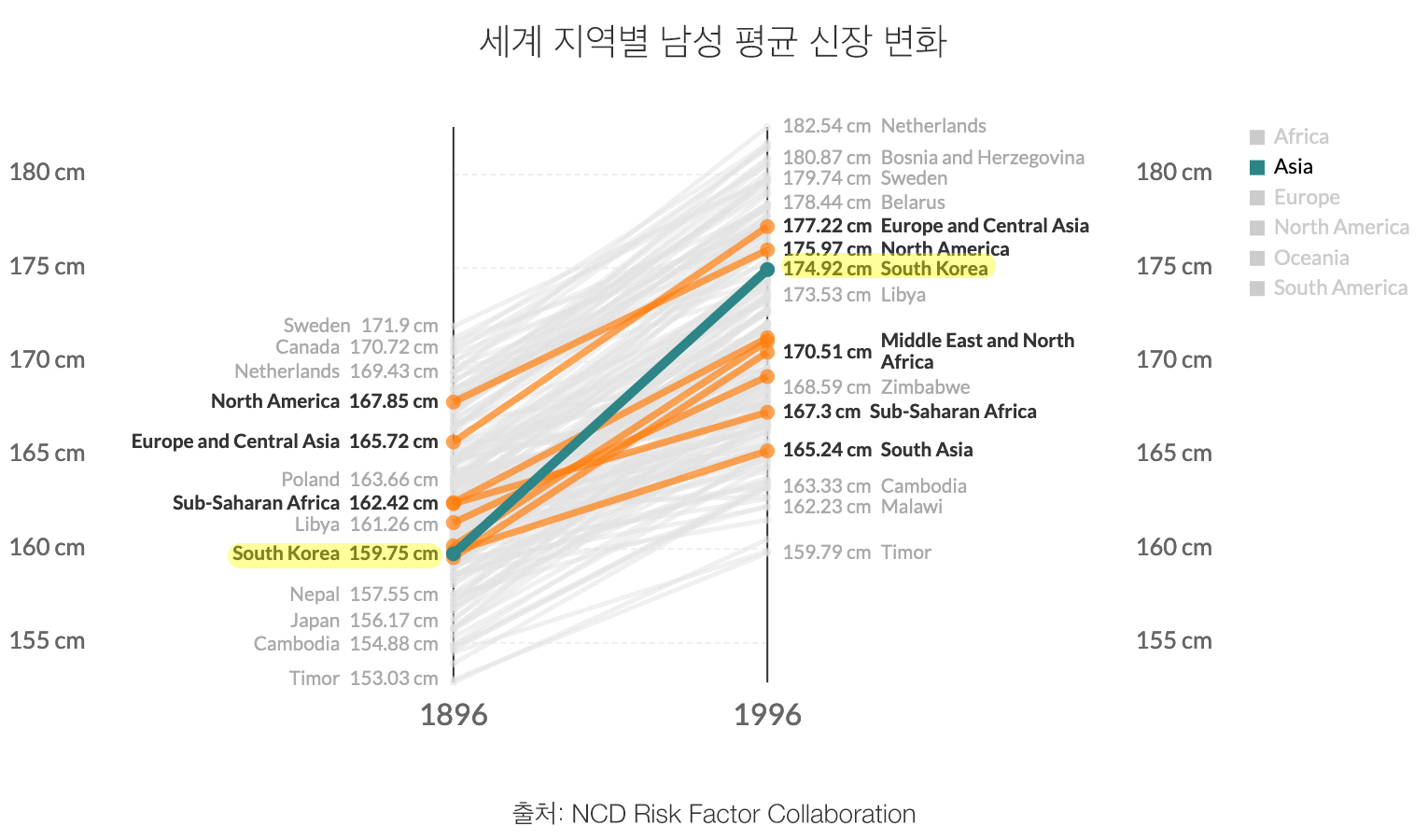 인간의 평균 신장의 변화에는 상당한 지역적 차이가 있다. 아래 차트를 보면 유럽과 중앙아시아 남성들의 키가 가장 크게 증가한 것을 알 수 있다. 그들의 평균 키는 11cm 증가해 북미 남성들을 추월했다. 남아시아 남성의 경우 절대 상승 폭이 5cm에 불과했다. 전반적으로, 남성 신장의 지역 간 차이는 지난 세기에 걸쳐 증가했다. 1896년에 태어난 남자들의 경우, 평균신장이 가장 작은 지역과 가장 높은 지역 사이의 차이가 8센티미터였다. 100년이 지난 후, 이 간격은 12cm로 늘어났다.
