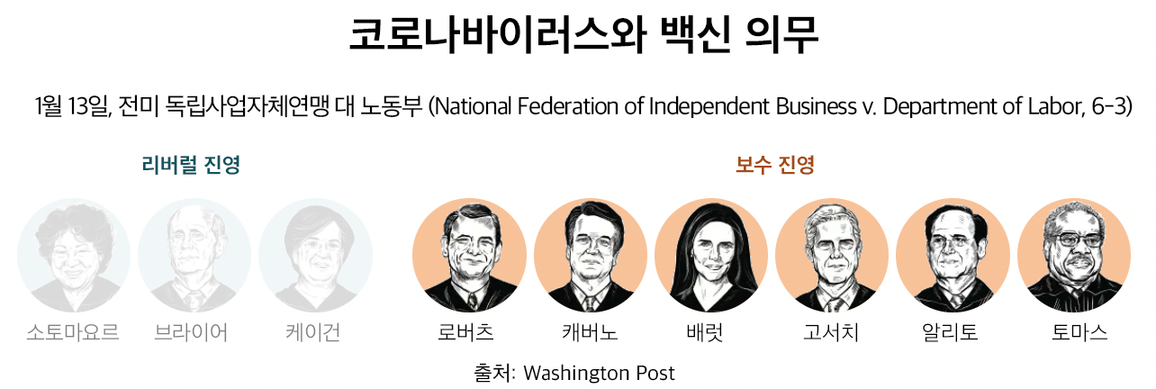 법원은 바이든 행정부의 미국 최대 고용주에 대한 백신 접종 또는 테스트 요구 사항을 차단했으며, 이는 코로나바이러스를 억제하고 국가의 백신 접종률을 높이려는 대통령의 특징적 이니셔티브에 타격을 입혔다. 법원은 일반적으로 주정부 팬데믹 이니셔티브를 지지했지만, 연방정부는 전국 사업장에 전면적인 요구사항을 부과할 권한이 없다고 말했다.