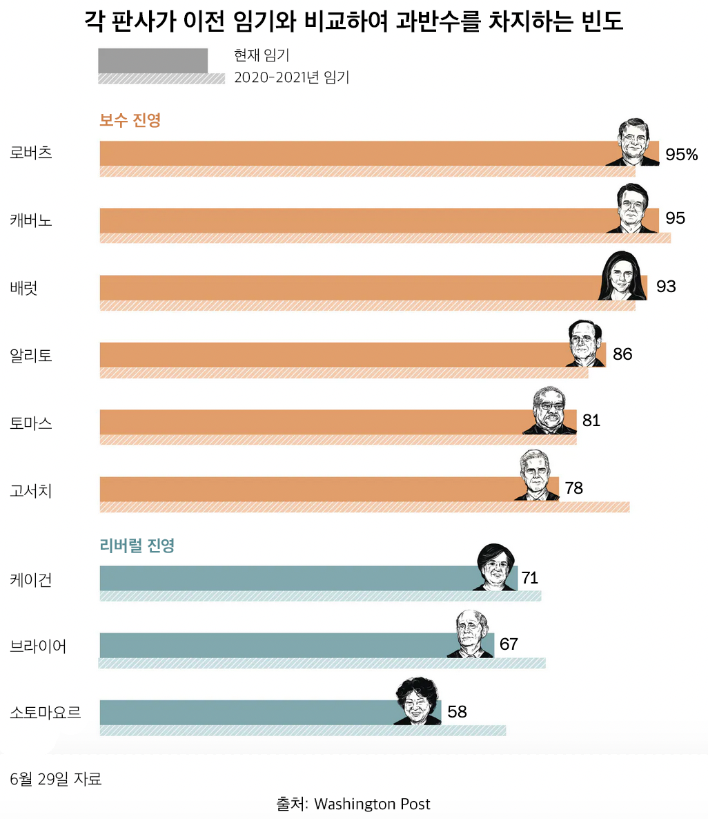 * 역자 주: 현재 미국 대법원 대법관은 존 로버츠(John Roberts) 대법원장을 포함해 모두 9명이다. 임명 순서에 따른 나머지 대법관 8명은 클래런스 토머스(Clarence Thomas), 스티븐 브라이어(Stephen Breyer), 새뮤얼 알리토(Samuel Alito), 소니아 소토마요르(Sonia Sotomayor), 엘레나 케이건(Elena Kagan), 닐 고서치(Neil Gorsuch), 브렛 캐버노(Brett Kavanaugh), 에이미 코니 배럿(Amy Coney Barrett Ketanji Brown Jackson)이다. 이 가운데서 민주당이 지명한 진보 진영 대법관은 소토마이어, 브라이어, 케이건 3명이며 나머지 6명은 모두 공화당이 지명한 보수 진영 대법관이다. 은퇴하는 브라이어 대법관은 최근 바이든 대통령이 지명한 최초의 흑인 여성 대법관 커탄지 잭슨(Ketanji Jackson)에 의해 계승되었다.