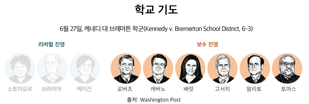 법원은 50야드 라인에서 경기 후 기도를 주도한 후 해고된 전직 고등학교 미식축구 코치의 편을 들었다. 보수 다수를 위해 판결문을 작성한 닐 M. 고서치(Neil M. Gorsuch)는 공립학교 행사에서 코치의 기도는 언론의 자유와 종교 활동에 대한 헌법의 보장에 의해 보호되며 정부의 종교 승인 금지를 위반하지 않았다고 말했다.