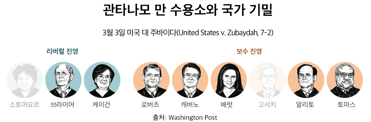 법원은 "국가 기밀" 독트린이 관타나모만 수감자가 폴란드의 "블랙 사이트"(black site) 시설에서 받은 학대에 대해 전직 CIA 계약자 2명에게 심문하는 것을 금지한다고 판결했다. 분열된 법원을 위해 판결문을 작성한 스티븐 브라이어(Stephen Breyer)는 아부 주바이다(Abu Zubaida)의 구금 및 치료에 대한 많은 세부 사항이 공개되어 있다는 사실이 정부가 이를 공개해야 한다는 것을 의미하지는 않는다고 말했다.