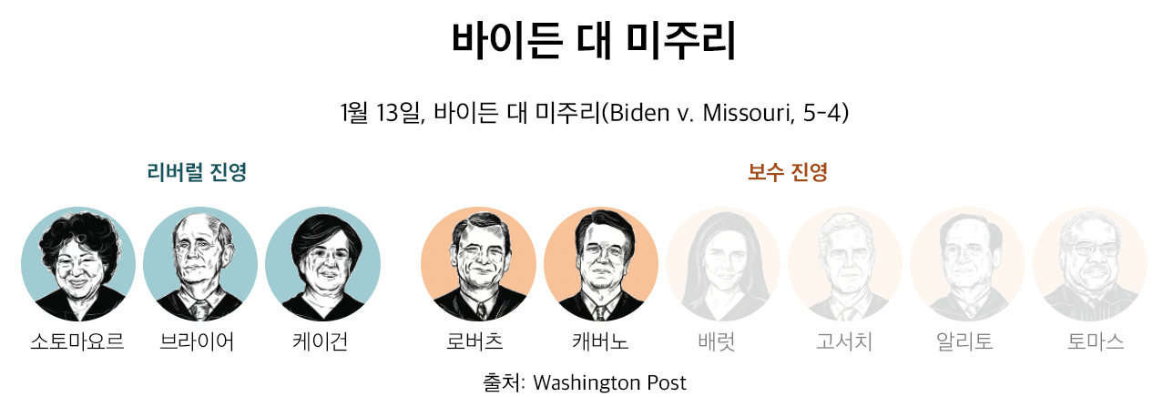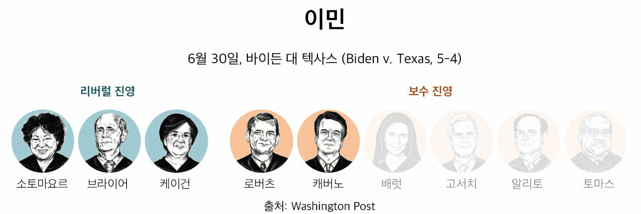 바이든 행정부는 망명 신청자의 사례가 미국 법원에서 검토되는 동안 멕시코에 남아 있어야 한다는 트럼프 시대의 정책을 뒤집을 권한을 갖고 있다고 대다수는 밝혔다. 로버츠 대법관과 캐버노 대법관은 연방 이민법이 행정부에 재량권을 부여하고 있다고 말하면서 법원의 세 명의 자유주의 대법관에 합류했다.