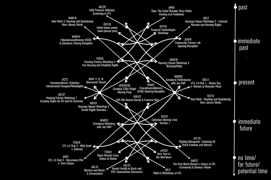 우리의 실천에는 양자 사건 지도, 주택 여정 지도, 음파 매핑 및 공동 메모리 매핑이 포함된다. 양자 사건 지도는 시간과 공간에 대한 아프리카와 아시아의 문화적 실천과 관점을 모방하여 개인 혹은 집단과 공동체로서 미래의 순간/사건들을 구성하거나 과거의 순간/사건들을 재점검하기 위해 "함께 시간 속에서 발생"하곤 하는 미시(혹은 양자) 사건들을 결합한다. 이 매핑 방법을 통해 사건 기억(미래 및 과거 기억 모두)은 특정 달력 날짜 또는 시계 시간에 부착되지 않고, 기억은 특정 날짜 또는 시간에 대해 형성되지 않는다. 오히려 시간과 날짜는 기억의 일부가 되어 미래의 기억에 내장되거나 짜여져 제어될 수 있다. 여러분이 선택한 날짜 또는 시간은 기억의 일부로 지도에 포함되므로 사건을 예측하거나(forecast) 재구성(backcast, 현재에서 미래를 예측하는 것이 아니라 원하는 미래를 설정하고 그 미래로부터 현재로 거슬로 내려오는 접근법 - 역자 주)할 수 있다. 시간은 기억을 정의하고 선행하는 것이 아니라 기억되는 것이 된다. 양자 사건 지도 제작자는 동시성을 정의하는 시간 대신 동시성/초점에서 적극적 주체가 된다. 우리의 워크숍에서 그룹은 커뮤니티가 다양하고 교차하는 시간 리듬과 다른 사건 질감과 특징들로 구성된 과거, 미래 또는 현재 사건을 중심으로 공동 시간을 구성하는 방식을 통해 투쟁할 수 있도록 하는 공동 양자 사건 지도를 만든다. 개인 양자 사건 지도는 지도 제작자가 개인 과거를 다시 방문하여 과거 사건의 새로운 특징을 만나고, 개인 미래를 계획하고 창조하거나, 개인적인 "지금"을 탐색하고 재맥락화하는 데 도움이 된다.