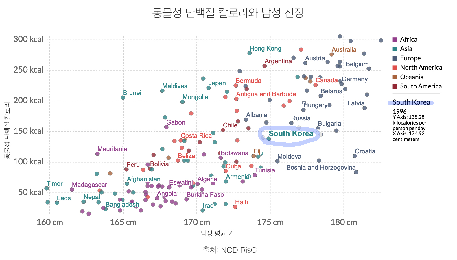 위의 차트에서 1996년에 출생해서 2014년에 만 18세 성인이 된 한국 남성의 평균 신장은 174.92cm이고, 동물 단백질로부터 얻는 일일 평균 칼로리는 138.28 kcl이다. 프랑스의 경우 일 인당 일일 동물 단백질 섭취량은 305.60kcal 신장은 179.74cm, 네덜란드는 298.52kcal에 평균 신장은 182.54cm, 아이슬란드는 297.48kcal에 평균신장이 180.49cm다. 그러나 동물 단백질 섭취량이 신장과 상당한 연관성이 있지만, 그 자체를 확실한 키를 결정하는 인과관계로 연결 지어서는 안된다. 가령 홍콩은 일 인당 일일 동물 단백질 섭취가 277.88kcal로 세계에서 5번째로 높지만 성인 남성 평균신장은 173.61cm로 한국보다 1cm가량 작다.