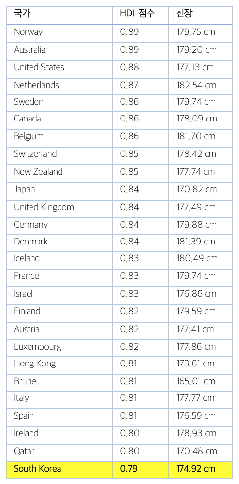 105 개국의 남성 키에 대한 그래스그루버 등(Grasgruber et al.) 연구는 “신장과 인간 개발 지수(HDI)는 대체로 인간 웰빙의 지표로 상호 교환될 수 있는 것 같다”라고 밝혔다. 한 국가의 인간개발지수와 연도별 평균 남성 신장의 관계를 보여주는 아래의 산점도에서 볼 수 있다. 여기서 우리는 생활 수준이 높은 국가에서 사람들이 더 키가 크다는 것을 알 수 있다. 개인의 키와 국가의 사회 경제적 발전 사이의 관계가 그토록 밀접한 이유는 무엇일까?